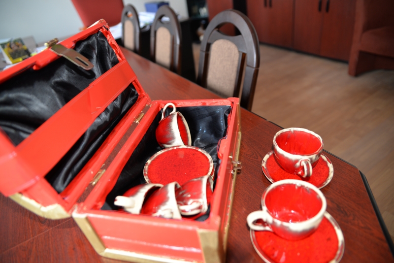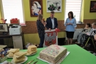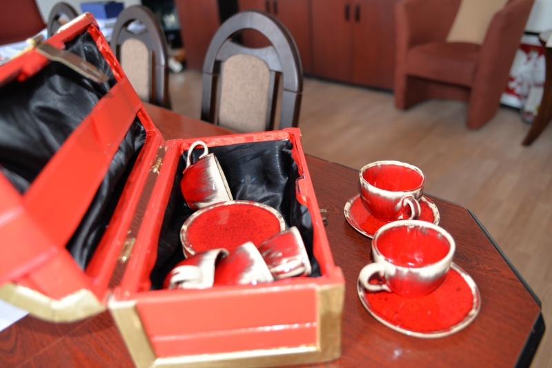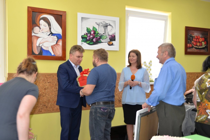 Jak na przyjęcie urodzinowe przystało nie mogło zabraknąć prezentów. Podopieczni Środowiskowego Domu Samopomocy wręczyli Panu Burmistrzowi wspaniałe upominki. Pierwszym z nich było Godło Połańca wykonane metodą qullingu, które wykonane zostało przez uczestników pracowni gospodarczej. Drugi prezent natomiast to przepiękny, ręcznie wykonany zestaw filiżanek, które zapakowane zostały w drewniany kufer, wykonany w ramach terapii zajęciowej przez uczestnika ŚDS, Pana Jerzego Fortunę. Pan Burmistrz serdecznie pogratulował podopiecznym posiadanych umiejętności i wręczył każdemu z nich symboliczny upominek. Zgodnie z obietnicą Godło Połańca zawisło na honorowym miejscu w gabinecie Pana Burmistrza, natomiast filiżanki używane mają być przy wyjątkowych okazjach.
