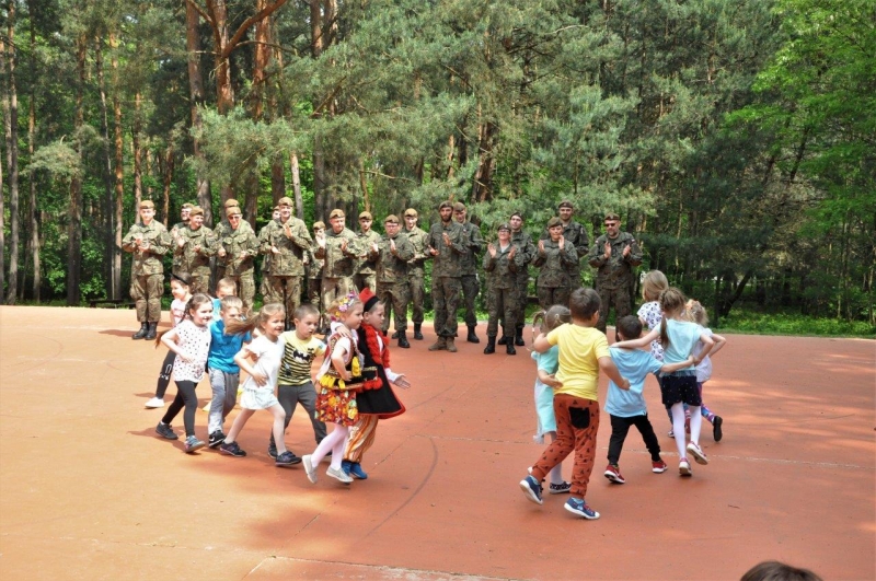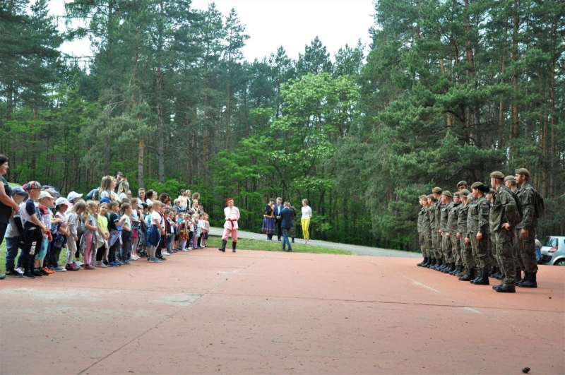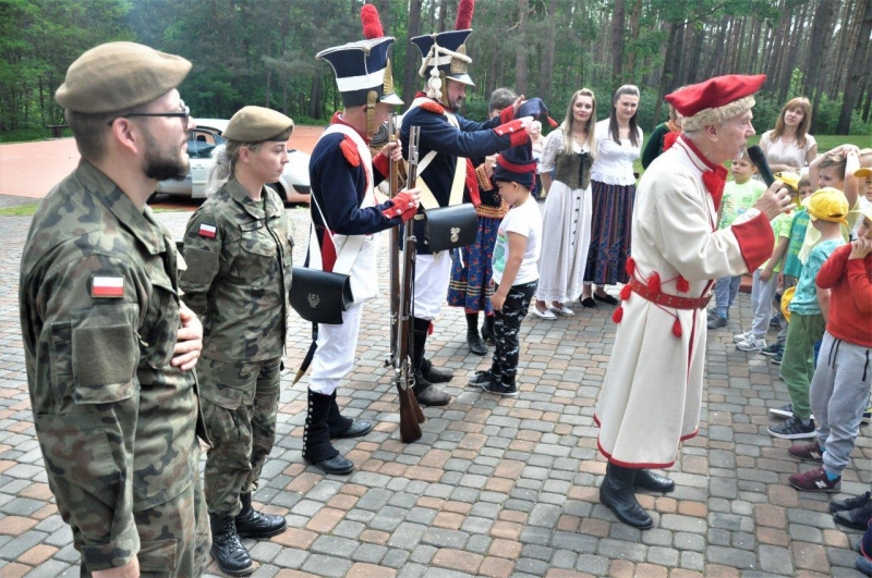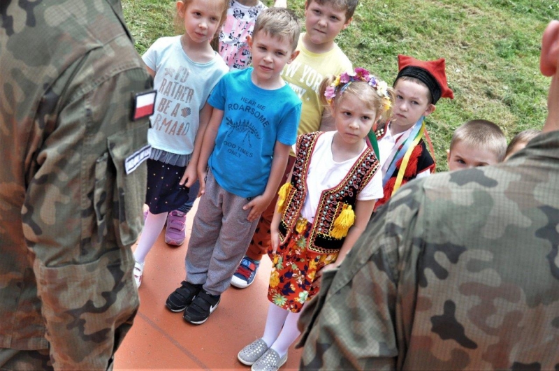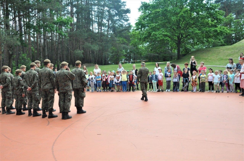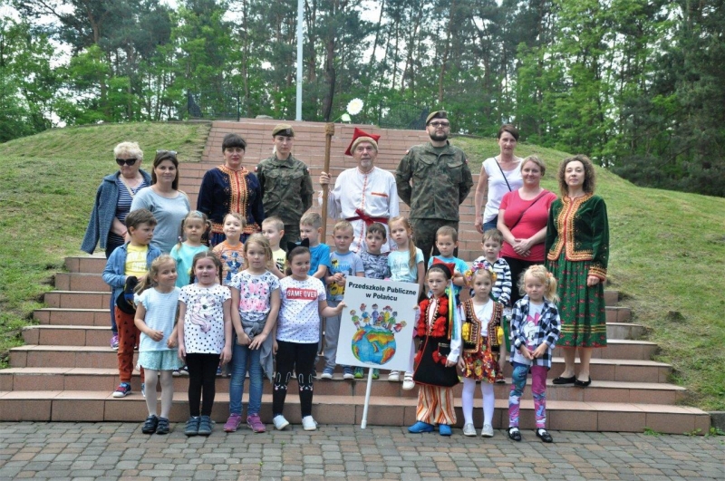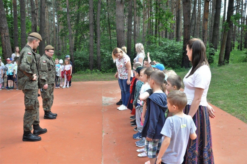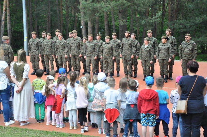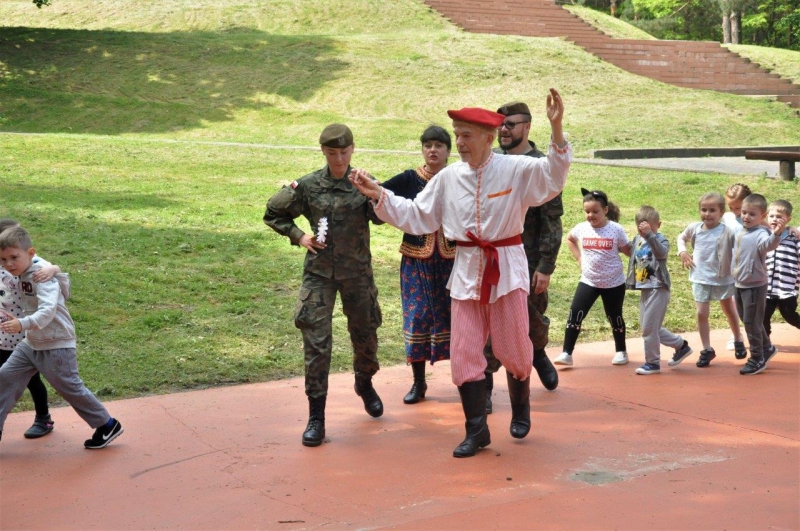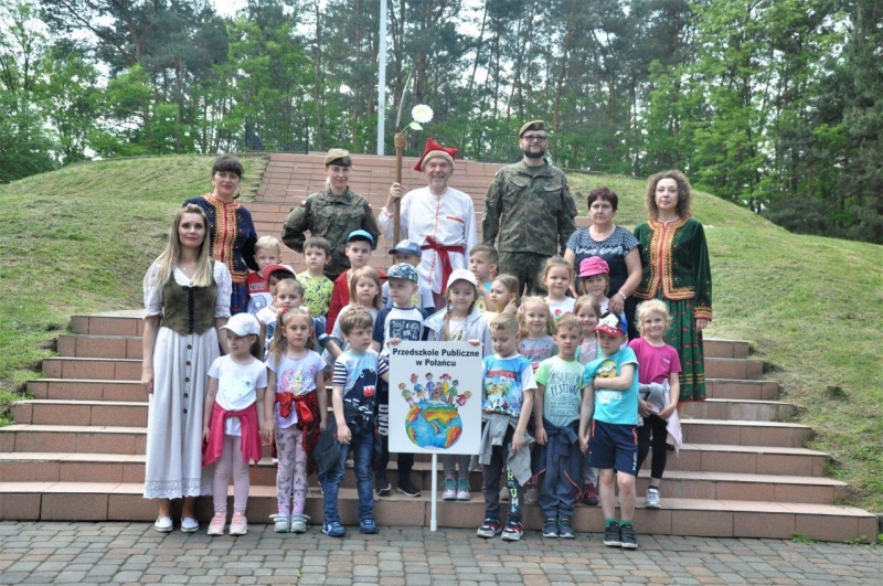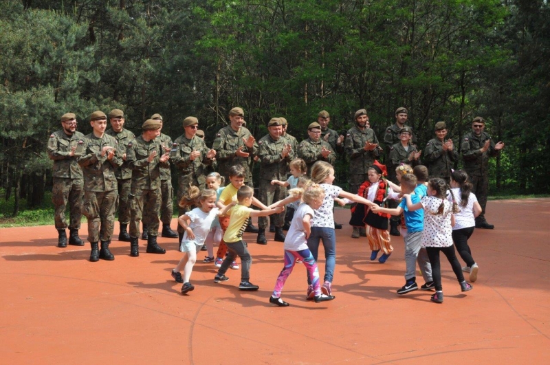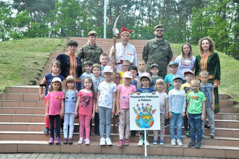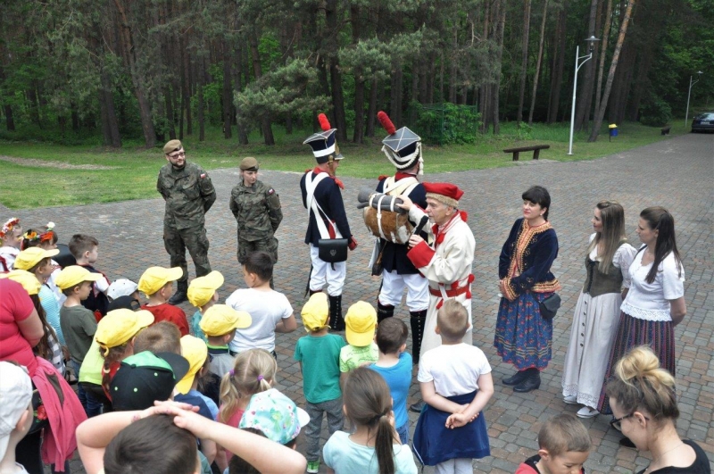 Członkowie Towarzystwa Kościuszkowskiego w Połańcu oraz przedstawiciele Świętokrzyskiego Batalionu Wojsk Obrony Terytorialnej opowiedzieli dzieciom o poszczególnych elementach umundurowania poszczególnych żołnierzy. Odbył się również pokaz uzbrojenia oraz ekwipunku, a także mała pozorowana walka wręcz. Dzieci bardzo chętnie zadawały i odpowiadały na pytania, a także brały udział w pokazie uzbrojenia. Przedszkolakom bardzo zaimponowała musztra żołnierska, w której wzięły czynny udział. Sporą niespodzianką dla najmłodszych był pokaz nabijania broni oraz wystrzały z karabinów czarnoprochowych żołnierzy połanieckiego oddziału Legii polsko-włoskiej. Następnie dzieci wzięły udział w grach i zabawach razem z kilkunastoma wojskowymi z Wojsk Obrony Terytorialnej. Tańczących i uśmiechniętych przedszkolaków odwiedził również Burmistrz Miata i Gminy Połaniec Jacek Tarnowski wraz z Dyrektor CkiSz w PołańcuJoanną Juszczyńską.