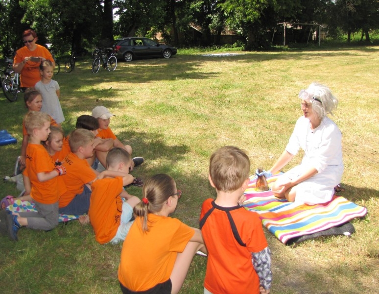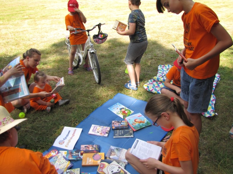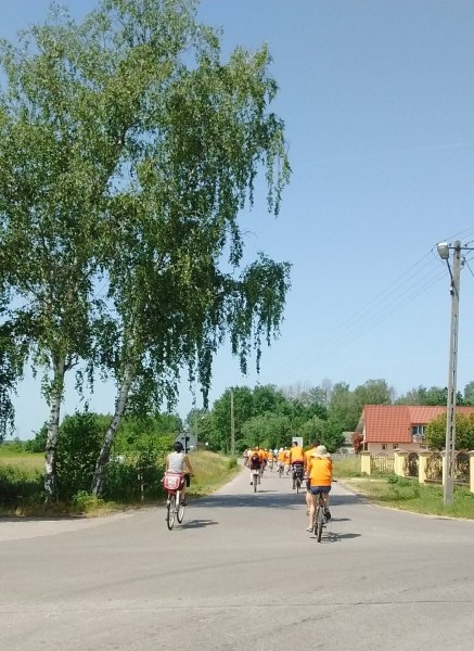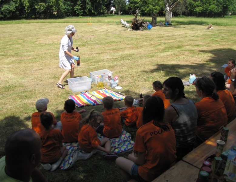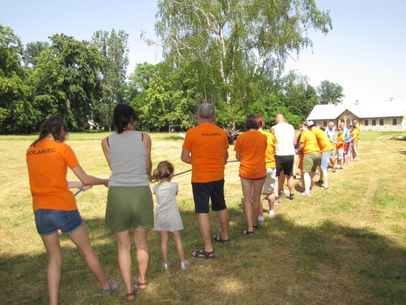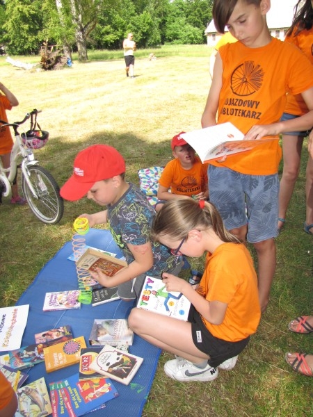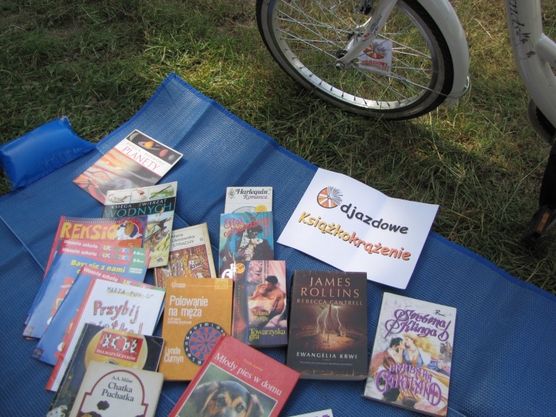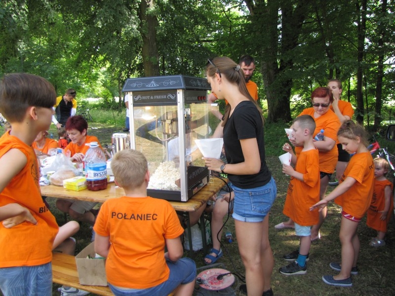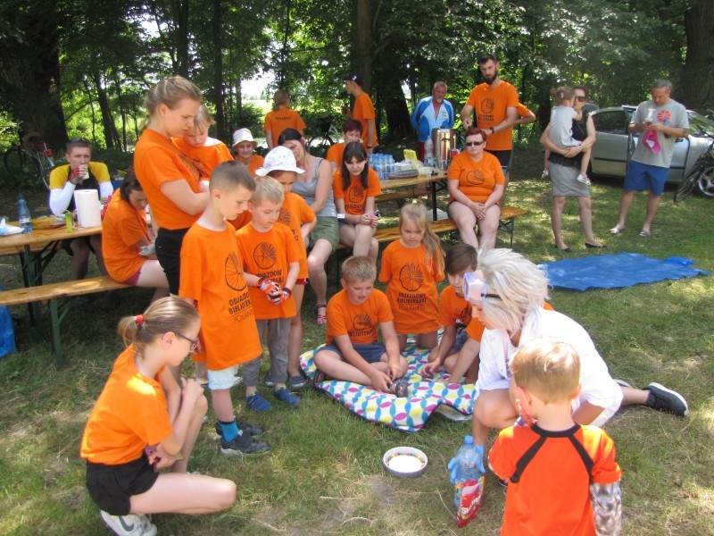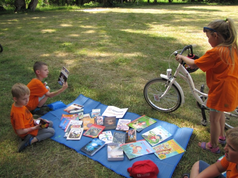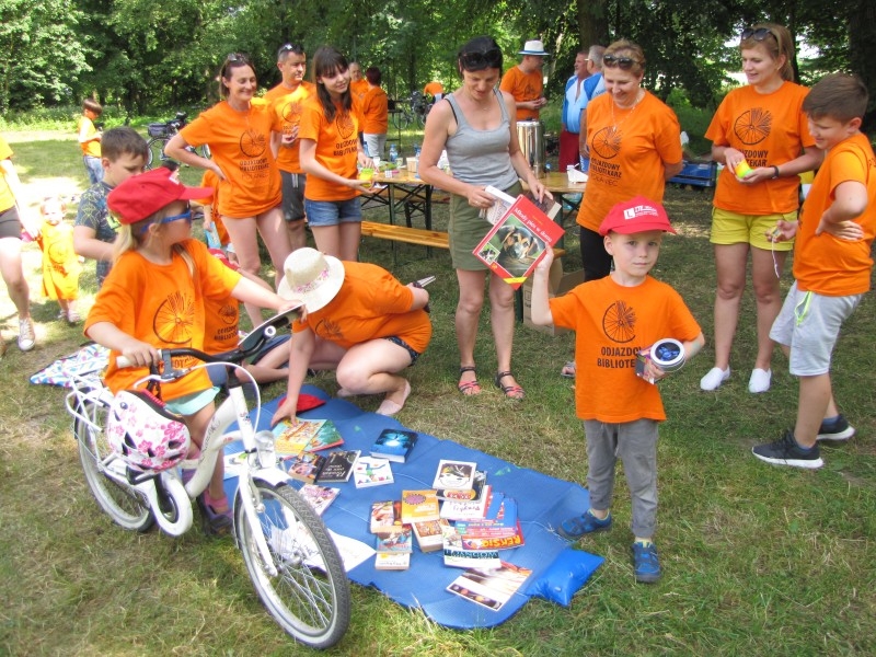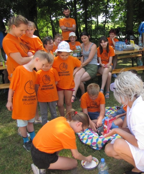 Jak co roku, już od siedmiu lat, w niedzielne przedpołudnie (16 czerwca) na parkingu obok biblioteki spotkali się bibliotekarze, członkowie PTTK oraz miłośnicy książek i wypraw na dwóch kółkach w każdym wieku, którzy zechcieli aktywnie spędzić dzień na powietrzu. Po krótkim powitaniu zgromadzonych, rozdaniu koszulek oraz przybliżeniu zasad bezpiecznej jazdy przez organizatorów, „odjazdowa drużyna” wyjechała na ulice miasta, przy okazji testując nowiutki odcinek ścieżki rowerowej wzdłuż ulicy Jana Pawła II. Tym razem trasa wycieczki prowadziła z Połańca do Ruszczy i z powrotem, a jej długość wyniosła około 30 kilometrów. Po przejechaniu rundy honorowej po Połańcu peleton w pomarańczowych koszulkach opuścił miasto. Dalsza trasa wiodła bocznymi drogami a także w większości przez las, dzięki czemu nie odczuwaliśmy aż tak gorąca. Pierwszy przystanek zrobiliśmy we wsi Grabowa. To tu skorzystaliśmy z gościnności naszej czytelniczki pani Jadwigi Paruch, która prowadzi Gospodarstwo Agroturystyczne w budynku po starej szkole. Przepiękny różany ogród w zaciszu lasu, raj dla motyli, był idealnym miejscem na odpoczynek. Popijając orzeźwiający owocowy kompot podziwialiśmy także cudne szydełkowe rękodzieła gospodyni. Zrelaksowani i pełni nowej energii wyruszyliśmy w dalsza drogę. Naszym miejscem docelowym, a zarazem drugim przystankiem w drodze powrotnej do Połańca, był park przy dworku w Ruszczy. Tutaj w cieniu pomnikowych drzew na głodnych rowerzystów czekały kiełbaski upieczone na grillu i przekąski. Było także coś do picia – na zimno i na gorąco. Na amatorów żywego ognia czekało drewno na ognisko, jednak nikt w taki upał nie odważył się go rozpalić. Można było także rozłożyć kocyki i uciąć sobie drzemkę. Po krótkim odpoczynku i wzmocnieniu się wszyscy, zarówno ci mali, jak i nieco starsi, zostali zaproszeni do szalonej zabawy z grupą animatorów Hokus Pokus z Buska-Zdroju. Na początek wystąpił jeszcze bardziej szalony profesorek z kilkoma niezwykłymi eksperymentami naukowymi. Dzieci robiły tęczę z kolorowych cukierków, oglądały wybuchy gejzerów i wulkanów w miniaturze oraz dowiedziały się jak zrobić pastę do zębów dla słonia. Były także zabawy z chustą Klanzy, wyścig w workach i przeciąganie liny. Można było spróbować swoich sił i przejść po linie w okularach zniekształcających rzeczywistość. Nie było to wcale łatwe. Ale to nie koniec atrakcji. W cieniu rozłożona została gigantyczna mata do twistera, która szybko znalazła amatorów wygibasów. Najmłodsi mieli swój kącik z zabawkami. Było też stanowisko do malowania tatuaży. Niecodzienną niespodziankę stanowił amerykański retro popcorn (świeżo prażony na miejscu). Bibliotekarski rajd rowerowy nie mógłby się odbyć bez książek. Dużym powodzeniem, zwłaszcza wśród małych czytelników, cieszyło się książkobranie, czyli rajdowy bookcrossing. Wiele książek znalazło swoich nowych właścicieli.