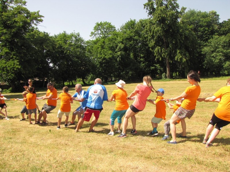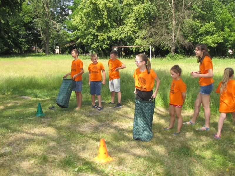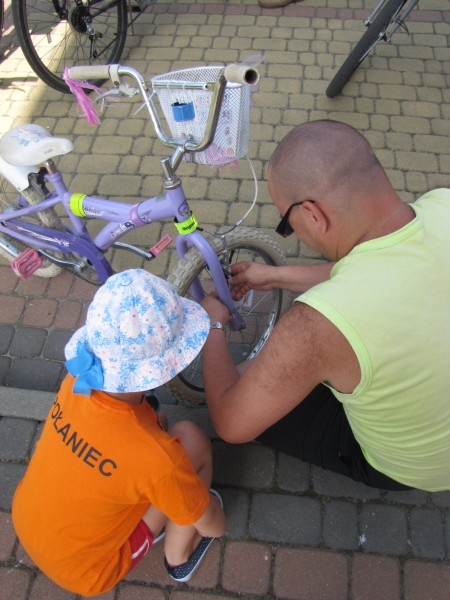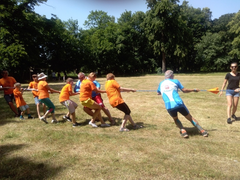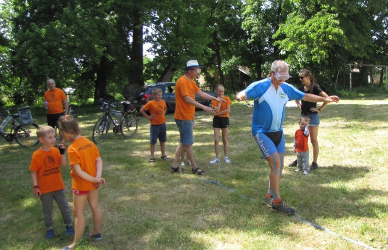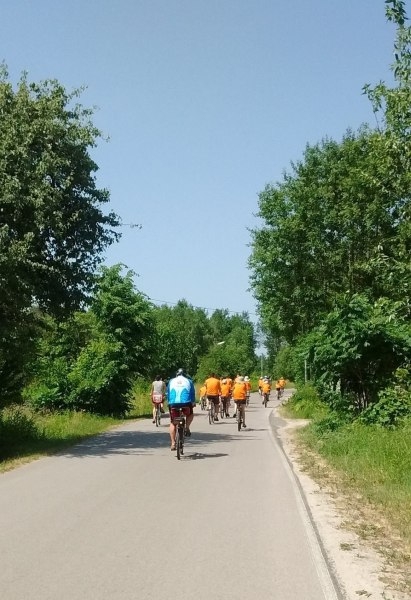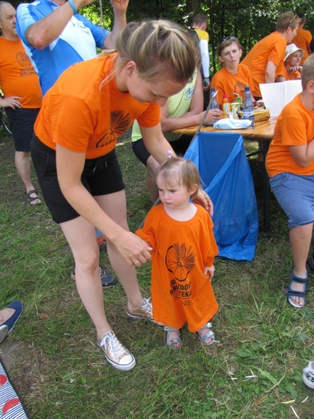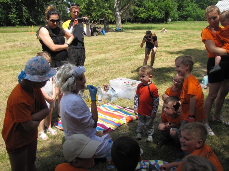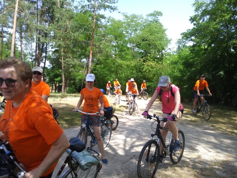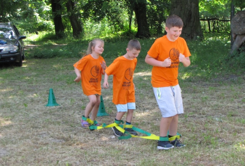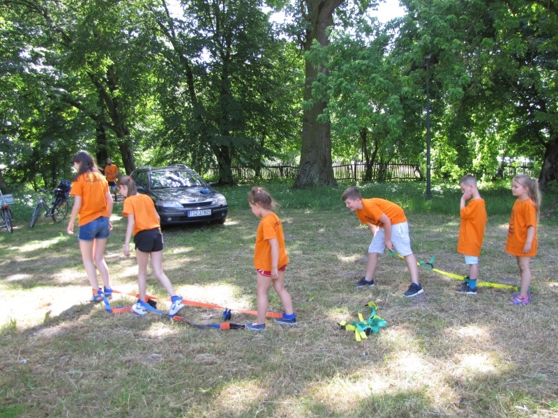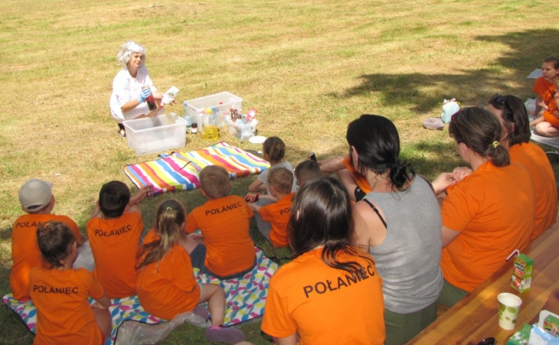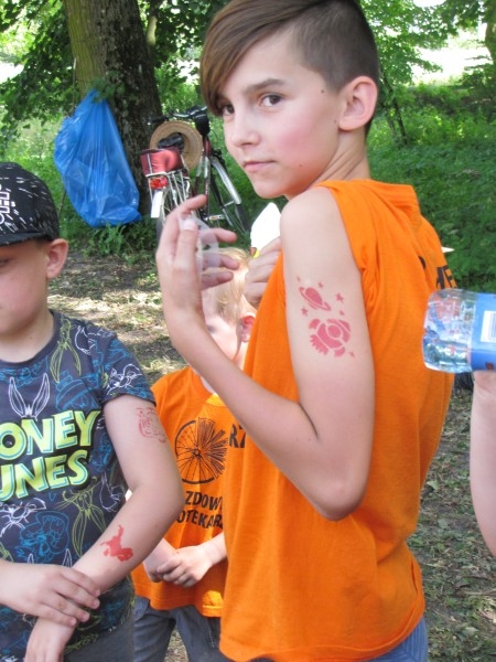 Jak co roku, już od siedmiu lat, w niedzielne przedpołudnie (16 czerwca) na parkingu obok biblioteki spotkali się bibliotekarze, członkowie PTTK oraz miłośnicy książek i wypraw na dwóch kółkach w każdym wieku, którzy zechcieli aktywnie spędzić dzień na powietrzu. Po krótkim powitaniu zgromadzonych, rozdaniu koszulek oraz przybliżeniu zasad bezpiecznej jazdy przez organizatorów, „odjazdowa drużyna” wyjechała na ulice miasta, przy okazji testując nowiutki odcinek ścieżki rowerowej wzdłuż ulicy Jana Pawła II. Tym razem trasa wycieczki prowadziła z Połańca do Ruszczy i z powrotem, a jej długość wyniosła około 30 kilometrów. Po przejechaniu rundy honorowej po Połańcu peleton w pomarańczowych koszulkach opuścił miasto. Dalsza trasa wiodła bocznymi drogami a także w większości przez las, dzięki czemu nie odczuwaliśmy aż tak gorąca. Pierwszy przystanek zrobiliśmy we wsi Grabowa. To tu skorzystaliśmy z gościnności naszej czytelniczki pani Jadwigi Paruch, która prowadzi Gospodarstwo Agroturystyczne w budynku po starej szkole. Przepiękny różany ogród w zaciszu lasu, raj dla motyli, był idealnym miejscem na odpoczynek. Popijając orzeźwiający owocowy kompot podziwialiśmy także cudne szydełkowe rękodzieła gospodyni. Zrelaksowani i pełni nowej energii wyruszyliśmy w dalsza drogę. Naszym miejscem docelowym, a zarazem drugim przystankiem w drodze powrotnej do Połańca, był park przy dworku w Ruszczy. Tutaj w cieniu pomnikowych drzew na głodnych rowerzystów czekały kiełbaski upieczone na grillu i przekąski. Było także coś do picia – na zimno i na gorąco. Na amatorów żywego ognia czekało drewno na ognisko, jednak nikt w taki upał nie odważył się go rozpalić. Można było także rozłożyć kocyki i uciąć sobie drzemkę. Po krótkim odpoczynku i wzmocnieniu się wszyscy, zarówno ci mali, jak i nieco starsi, zostali zaproszeni do szalonej zabawy z grupą animatorów Hokus Pokus z Buska-Zdroju. Na początek wystąpił jeszcze bardziej szalony profesorek z kilkoma niezwykłymi eksperymentami naukowymi. Dzieci robiły tęczę z kolorowych cukierków, oglądały wybuchy gejzerów i wulkanów w miniaturze oraz dowiedziały się jak zrobić pastę do zębów dla słonia. Były także zabawy z chustą Klanzy, wyścig w workach i przeciąganie liny. Można było spróbować swoich sił i przejść po linie w okularach zniekształcających rzeczywistość. Nie było to wcale łatwe. Ale to nie koniec atrakcji. W cieniu rozłożona została gigantyczna mata do twistera, która szybko znalazła amatorów wygibasów. Najmłodsi mieli swój kącik z zabawkami. Było też stanowisko do malowania tatuaży. Niecodzienną niespodziankę stanowił amerykański retro popcorn (świeżo prażony na miejscu). Bibliotekarski rajd rowerowy nie mógłby się odbyć bez książek. Dużym powodzeniem, zwłaszcza wśród małych czytelników, cieszyło się książkobranie, czyli rajdowy bookcrossing. Wiele książek znalazło swoich nowych właścicieli.