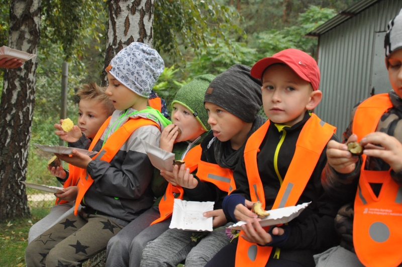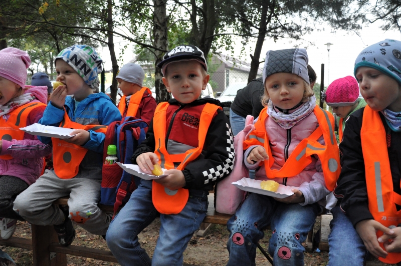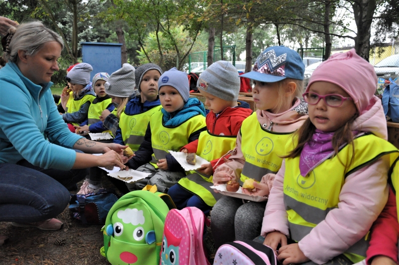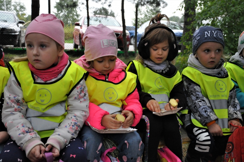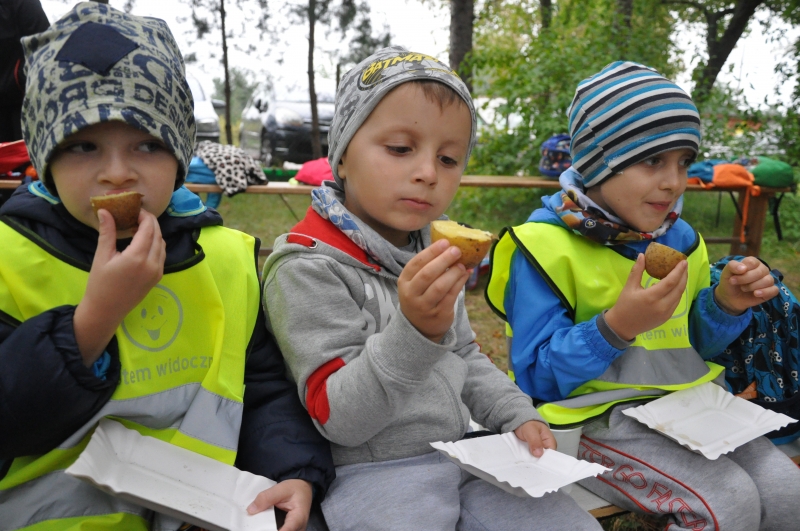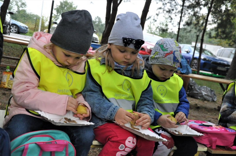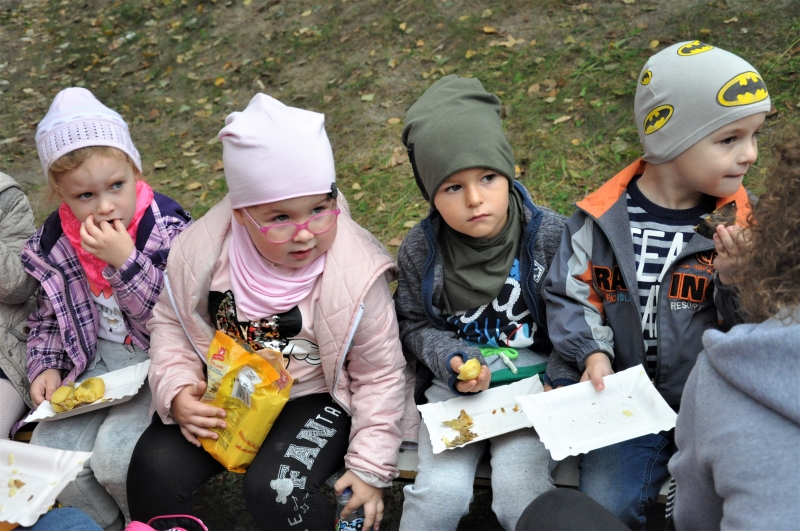 I nadeszła pora na bohatera dzisiejszego dnia – ziemniaka wprost z ogniska! Świeżo upieczony smakował wybornie! Zatem apetyt dzieciom dopisywał! I tak zadowoleni, nieco zmęczeni wróciliśmy do przedszkola. Te dwa jesienne dni pachnące pieczonym ziemniakiem były bardzo udane i dostarczyły wszystkim wiele radości i pozytywnych wrażeń.