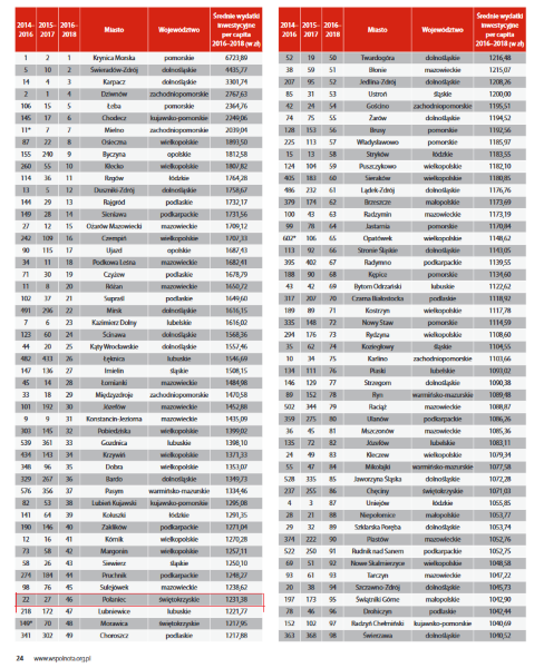 Ranking opracowywany jest przez profesora Pawła Swianiewicza z Uniwersytetu Warszawskiego na podstawie obiektywnych danych Głównego Urzędu Statystycznego oraz danych Ministerstwa Finansów. Zestawienia wszystkich samorządów analizowane są na podstawie obiektywnych danych z GUS pod kątem kilku aspektów. W kategorii miasta inne ranking Pisma Samorządowego „Wspólnota” zdominował Połaniec ze średnimi wydatkami inwestycyjnymi per capita (w przeliczeniu na mieszkańca) w wysokości 1231,38 zł. Warto przypomnieć, że w latach 2015 – 2017 Połaniec zajmował 27 miejsce ze średnimi wydatkami per capita 1118,37 zł. Z kolei w latach 2014- 2016 uplasowaliśmy się na 22, a średnie wydatki to 1166,43 zł. I w latach 2013 – 2015 Połaniec był na bardzo wysokim 16 miejscu przy wydatkach 1372,13 zł per capita.