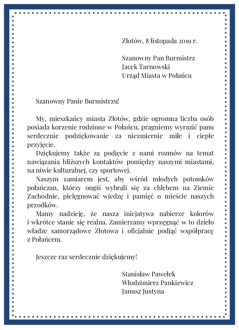 W zeszłym miesiącu mieliśmy zaszczyt gościć w Połańcu dwóch mieszkańców Złotowa – Pana Stanisława Pawełka, znanego działacza społecznego, wiceprezesa stowarzyszenia Civitas Christiana w Pile oraz Pana Włodzimierza Pankiewicza artystę z Zakrzewa.