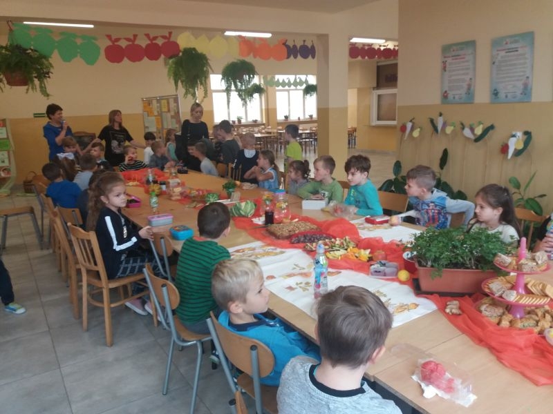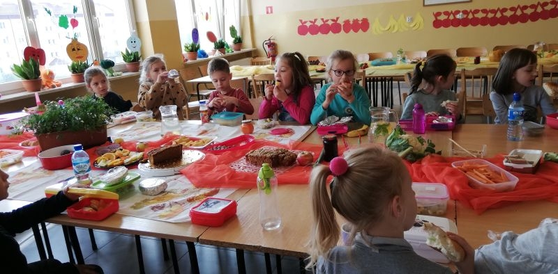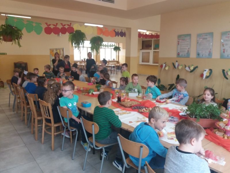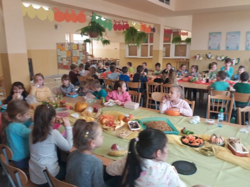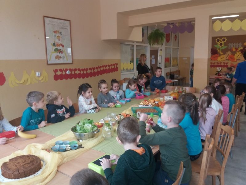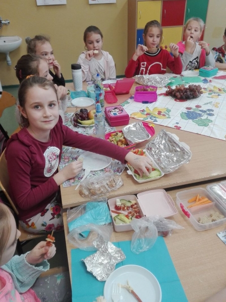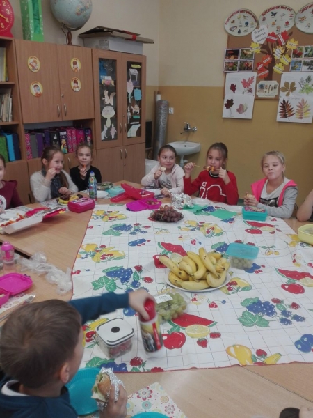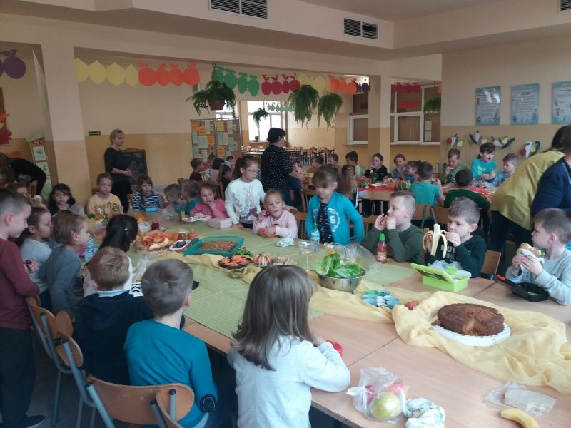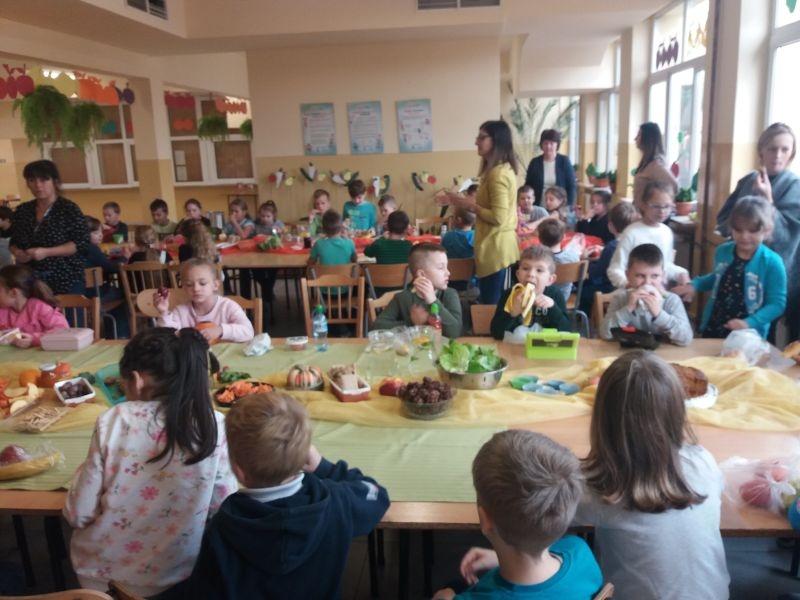 Aby wypromować zdrowy styl życia wśród dzieci i młodzieży, w dniu 8 listopada społeczność szkoły podstawowej w Połańcu włączyła się w europejskie obchody Dnia Zdrowego Śniadania. W ramach przygotowań do tego dnia, dzień wcześniej nadano komunikat przez radiowęzeł szkolny, przygotowano wystawkę promującą ideę spożywania drugiego, zdrowego śniadania w szkole, oraz przygotowano dekorację stołówki szkolnej. Ósmego listopada, wszyscy uczniowie klas pierwszych zostali zaproszeni przez wychowawców i dzieci ze świetlicy szkolnej na uroczyste zdrowe śniadanie do stołówki szkolnej. Przy pięknie nakrytych stołach ze zdrową żywnością, uczniowie zjedli ze swoimi wychowawcami zdrowe kanapki, warzywa, owoce, sałatki przygotowane przez rodziców. Spotkanie było okazją do wspólnej rozmowy, zabawy i rozwiązywania zagadek o zdrowym odżywianiu. Wiedza dzieci na ten temat pozytywnie nas zaskoczyła, wykazały się znajomością nazw warzyw i owoców, nawet tych egzotycznych. Ważnym aspektem spotkania był problem marnowania żywności, o którym informowała nas zrobiona wystawka. W czasie śniadania towarzyszyła nam muzyka - piosenki o zdrowym odżywianiu. Oprócz działań przygotowanych w stołówce szkolnej odbyły się także zdrowe śniadania w klasach. Wychowawcy klas wspólnie z uczniami zorganizowali zdrowe śniadanie w swoich oddziałach klasowych. Dziękujemy wszystkim uczestnikom projektu za zaangażowanie i pomoc. Zapraszamy do obejrzenia relacji fotograficznej.