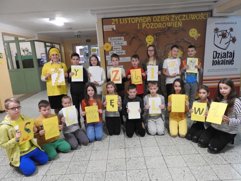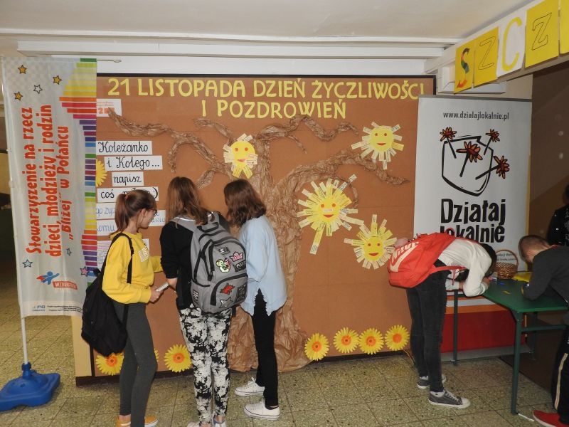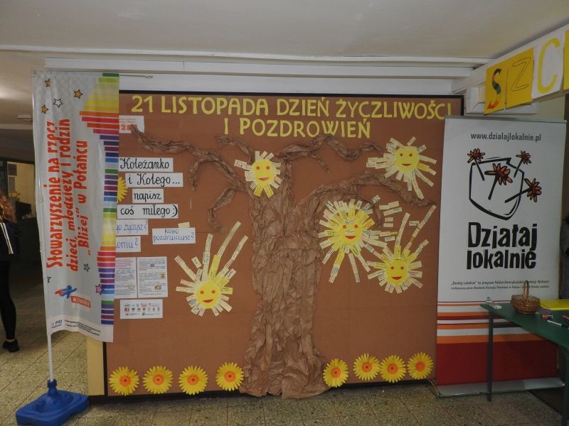 - 21.11.2019 r. DZIEŃ ŻYCZLIWOŚCI - Była to kolejna okazja do przystrojenia naszego drzewa tym razem w żółte słoneczka. Na promykach można było napisać coś miłego dla koleżanki i kolegi. Nasze główne hasło na ten dzień to „SZCZĘŚLIWI BO ŻYCZLIWI...”