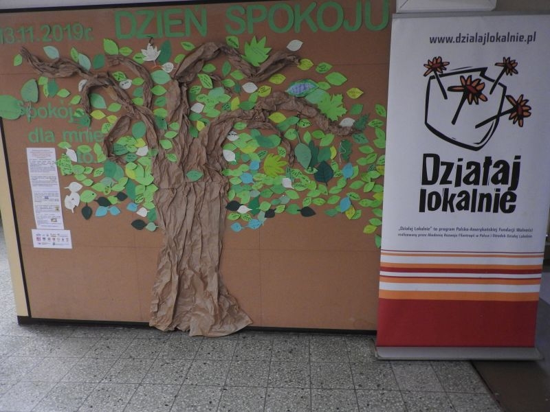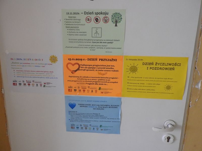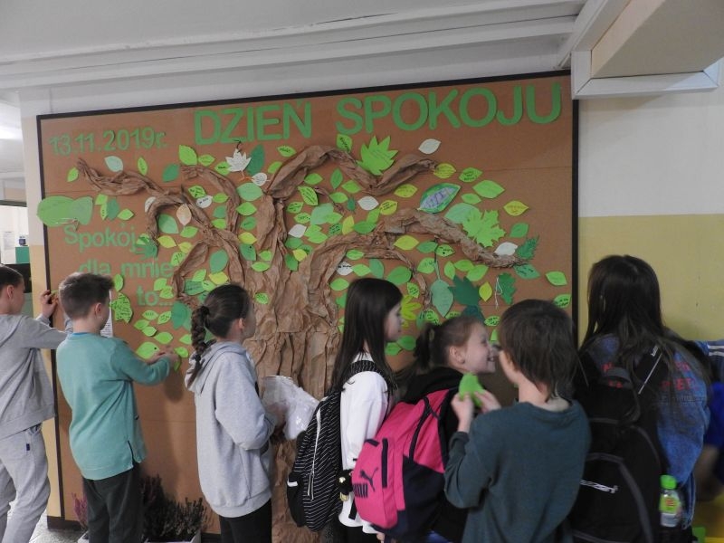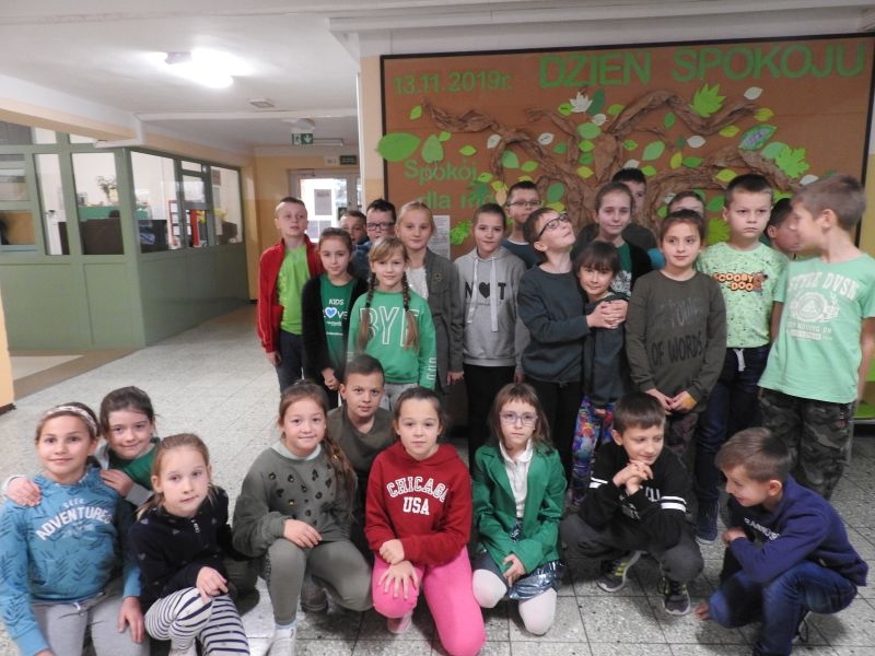 - 13.11.2019 r. DZIEŃ SPOKOJU - był to dzień bez dzwonków, bez telefonów i bez pytania. Dzieci i młodzież odpowiedzieli na naszą propozycję ubiorem w zielonym kolorze, większość zostawiła telefony w domu, na przerwach było zdecydowanie spokojniej i milej.
