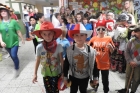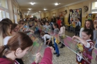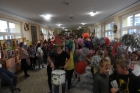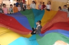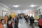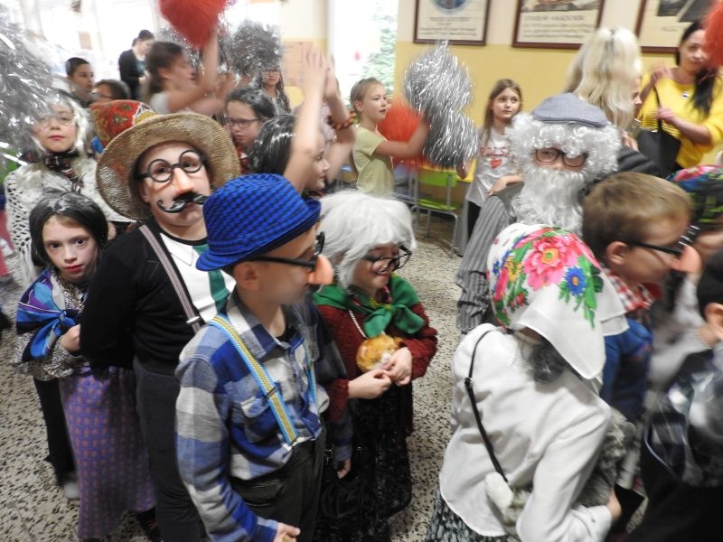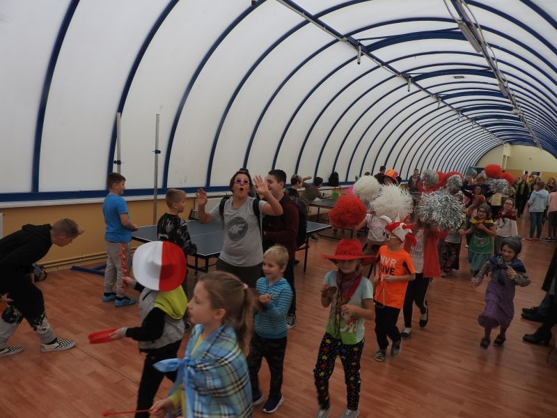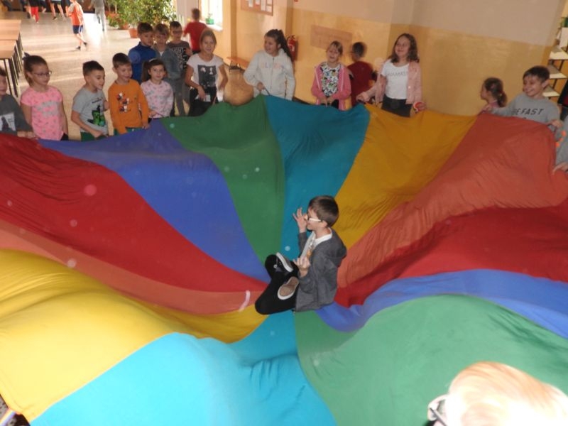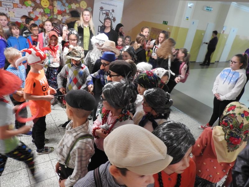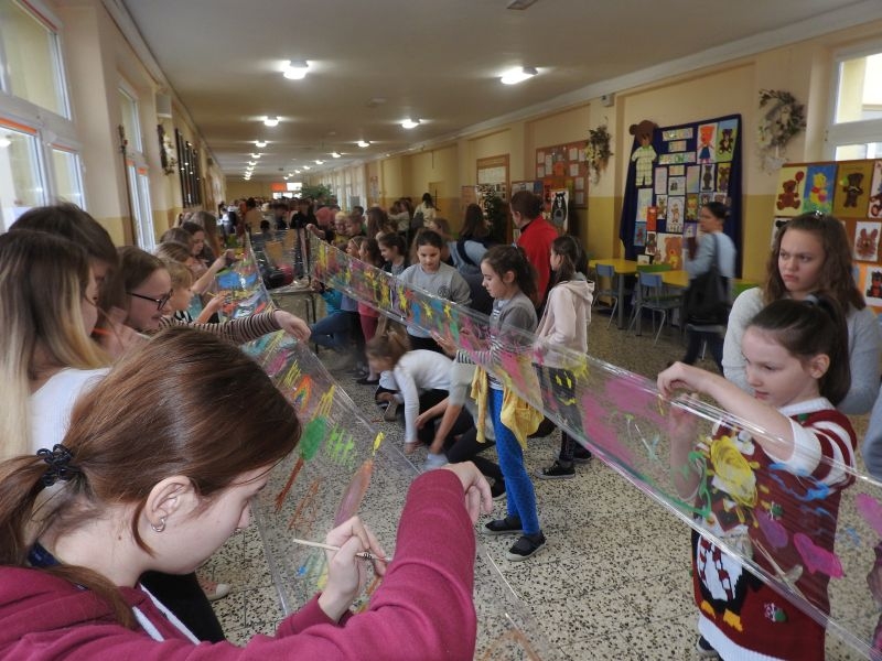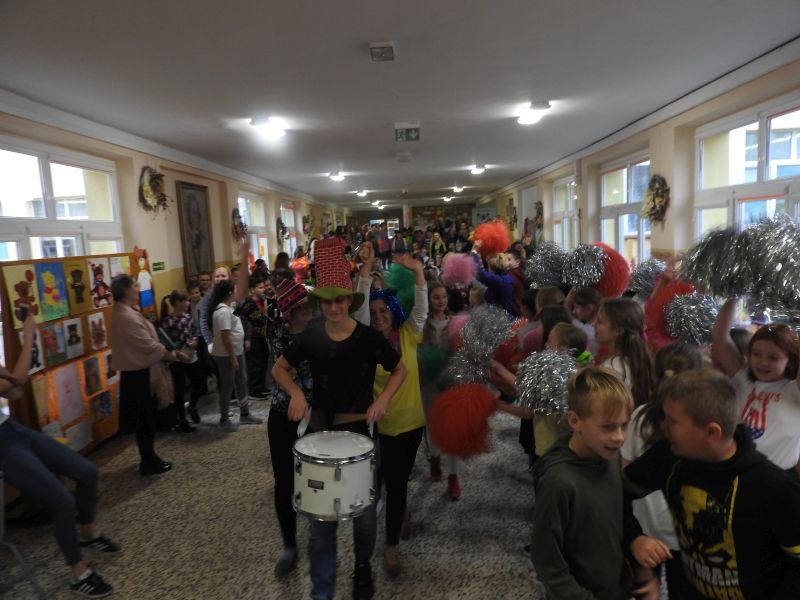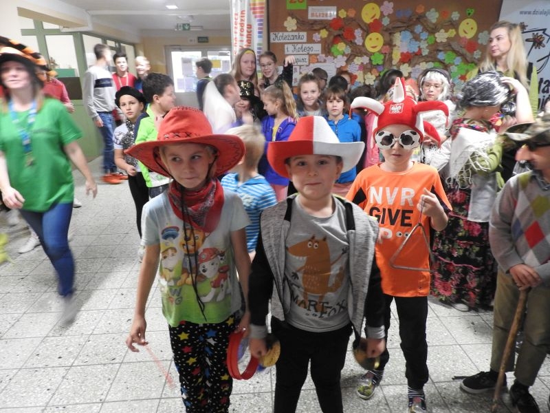 Dzieci miały okazję bawić się kolorowymi chustami animacyjnymi. Radość na wszystkich buziach mówiła, że warto takie akcje powtarzać. Następna atrakcja czekała na wszystkich uczniów na holu głównym, a było to malowanie obrazu radości na folii. Ilość zaangażowanych osób i powstałe dzieło zachwyciło organizatorów. Nasi uczniowie są wspaniali!!! Na koniec tego dnia przez szkołę przeszedł KOLOROWY KOROWÓD RADOŚCI. Wspaniale przebrali się uczniowie kl. II c. Stanowili dziarską grupkę staruszków, którym nic nie przeszkadzało, aby cieszyć się z tego dnia. Zobaczcie sami, jak było świetnie