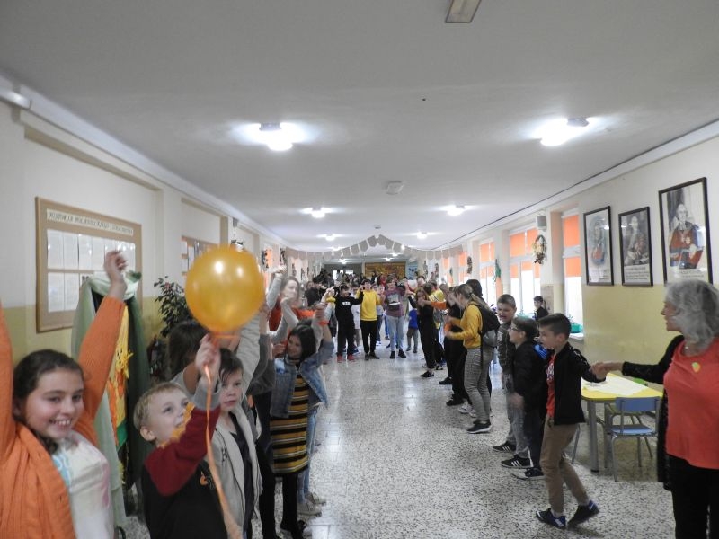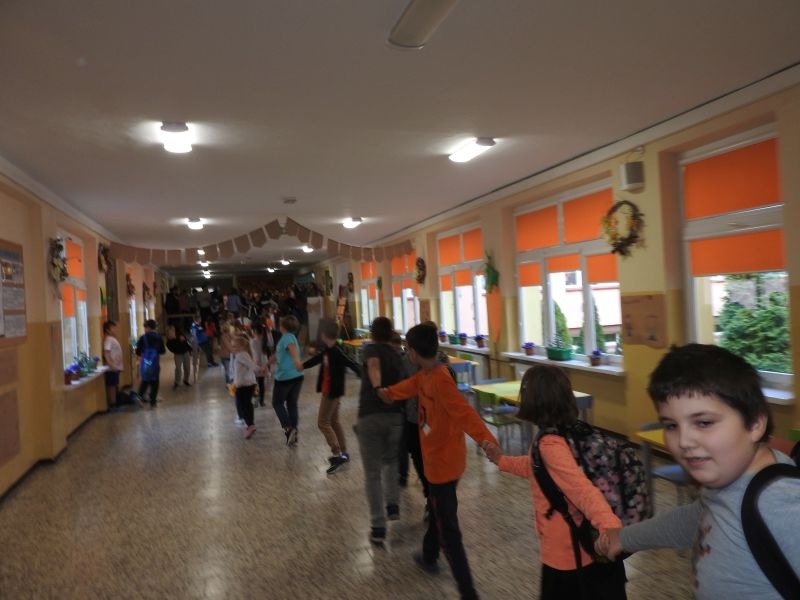 Tego dnia na dużej przerwie na holu głównym pojawił się łańcuch przyjaźni, który ciągnął się przez całyyyyyyy, dłuuuuuugi korytarz. Wszyscy: uczniowie, nauczyciele, dyrekcja, chwycili się za ręce. Na koniec wznieśliśmy okrzyki na cześć przyjaźni: - Przyjaźń, przyjaźń, przyjaźń - hip hip hura!!