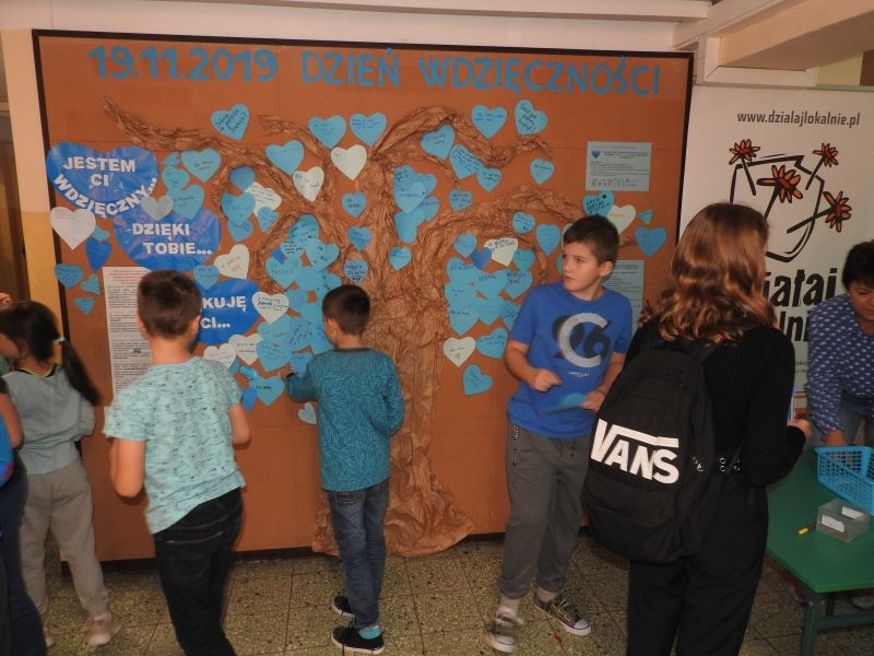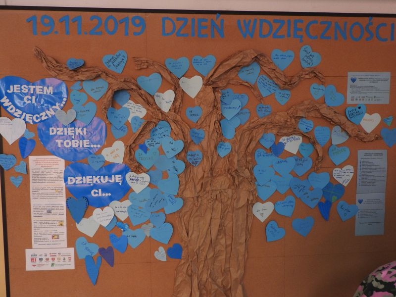 - 19.11.2019 r. DZIEŃ WDZIĘCZNOŚCI - Dzień wdzięczności zapisał się w pamięci wszystkich uczniów i nauczycieli naszej szkoły na niebiesko. Nasze drzewo na holu głównym wystrojone było w serduszka wdzięczności.