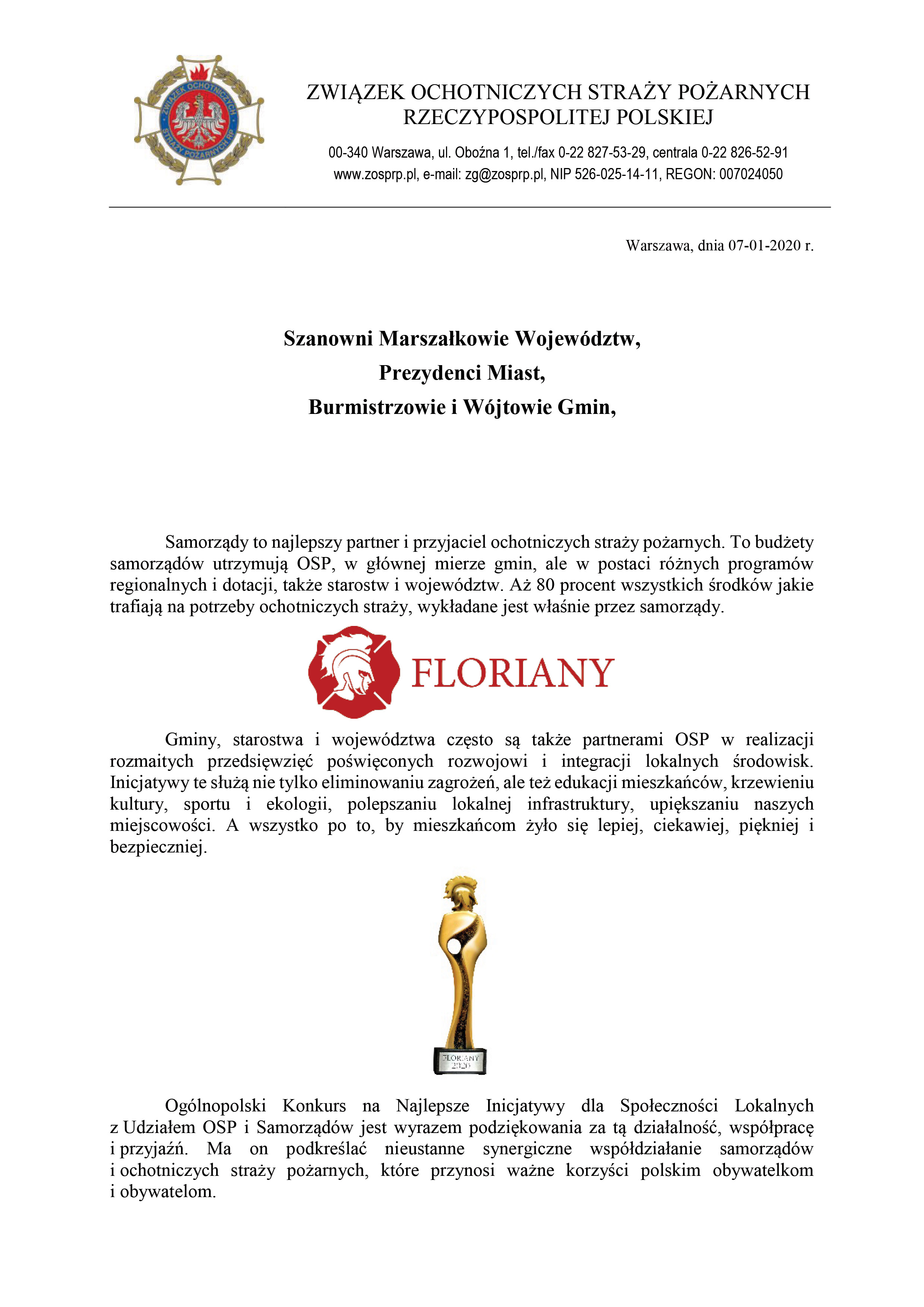 Ruszyła IV edycja Ogólnopolskiego Konkursu na Najlepsze Inicjatywy dla Społeczności Lokalnych z Udziałem OSP i Samorządów FLORIANY. To sztandarowe przedsięwzięcie Związku Ochotniczych Straży Pożarnych RP promujące społeczną działalność strażaków ochotników nazywane strażackimi Oscarami.