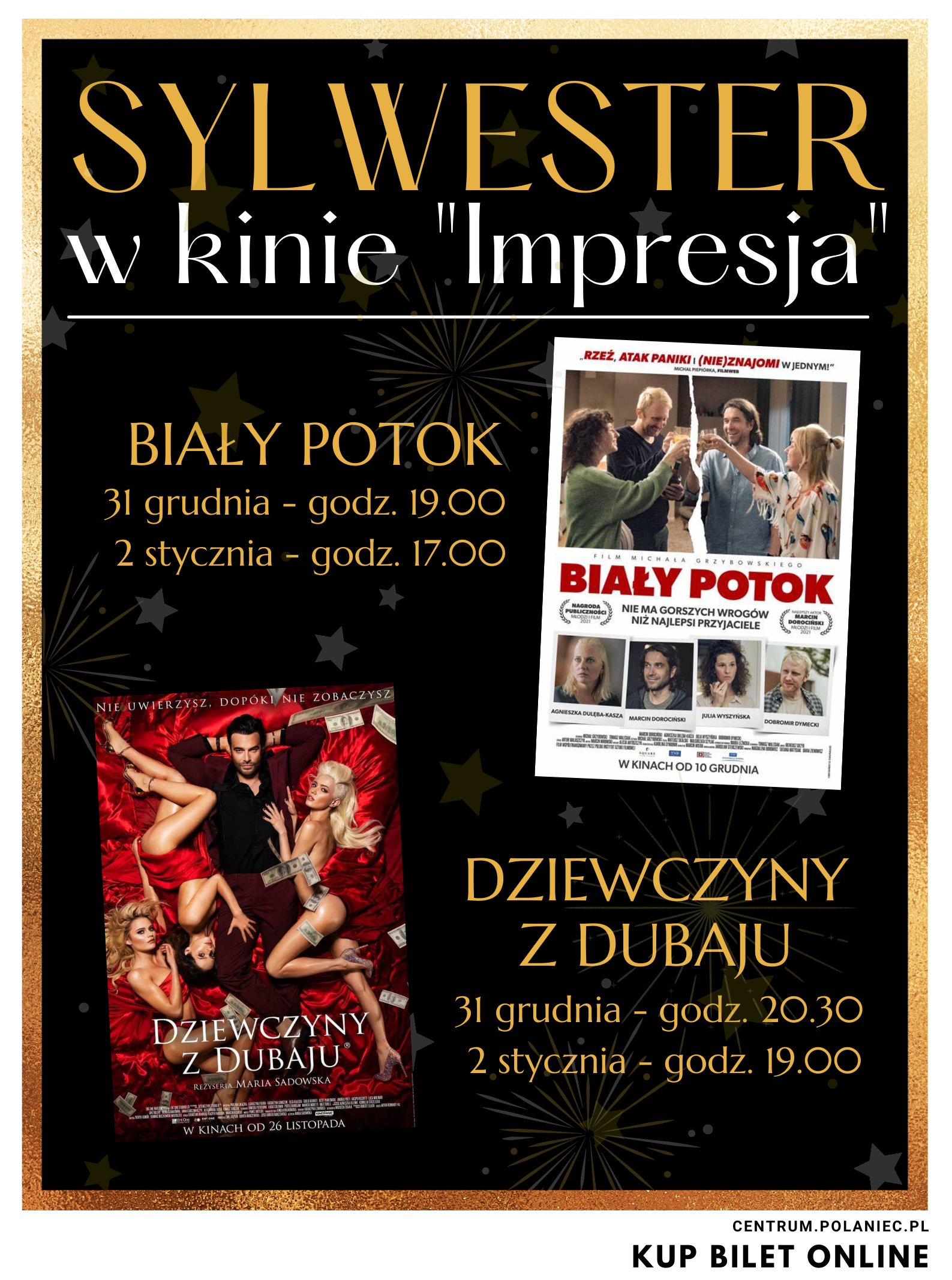 Już dziś rezerwujcie sobie czas na SYLWESTRA W KINIE IMPRESJA. W ostatnią noc w roku zapraszamy na dwie ciekawe produkcje filmowe. "Biały Potok" to polska komedia omyłek w gwiazdorskiej obsadzie, opowiadająca o perypetiach dwóch zaprzyjaźnionych małżeństw."Dziewczyny z Dubaju" to zrealizowana z rozmachem ekranizacja głośnej książki o aferze dubajskiej z 2015 roku. Oba filmy warto obejrzeć.