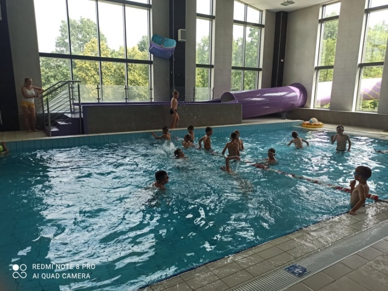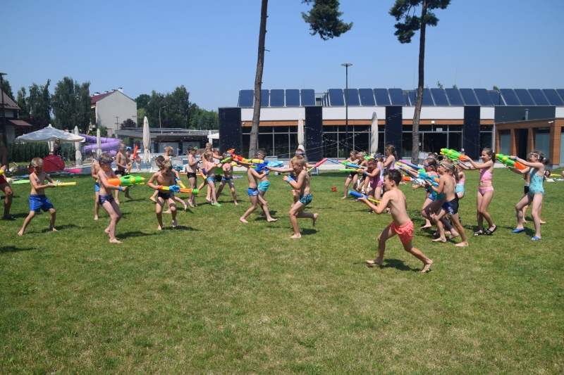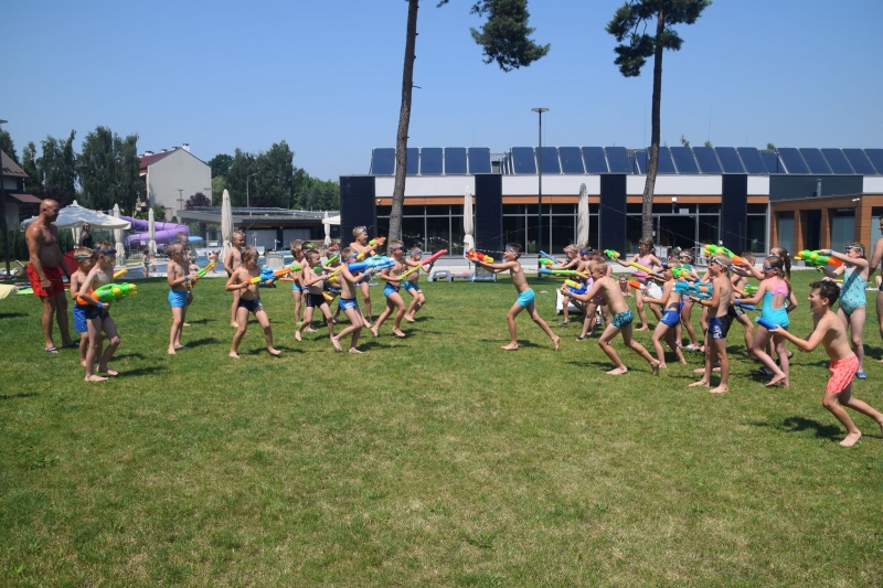Dzieci, pod czujnym okiem trenerów, brały udział również w doskonaleniu techniki pływania. Ogromną frajdęsprawiła wszystkim „bitwa wodna”, gdzie drużyny miały bronić swoich instruktorów.