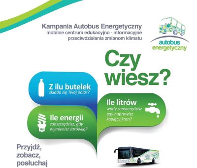 Zapraszamy mieszkańców do udziału w kampanii "Autobus Energetyczny - mobilne centrum przeciwdziałania zmianom klimatu" , której celem jest zwiększenie świadomości społecznej na temat przyczyn zachodzenia zmian klimatu, działań, jakie można podjąć, aby im przeciwdziałać oraz zachęcenie każdego z odbiorców kampanii do podejmowania kroków na rzecz przeciwdziałania zmianom klimatu w codziennym życiu i otoczeniu: w domu, w pracy, w szkole, lokalnym środowisku. W tym celu przyjedzie do Połańca wyposażony w modele, makiety i prezentacje autobus wraz z obecnymi w nim ekspertami, który będzie dostępny przez dwa dni (22-23 marca 2016 roku) w godzinach od 10:00 do 18:00. Energetyczny autobus będzie stacjonował na parkingu ul. Ruszczańska (pomiędzy budynkiem Urzędu Miasta i Gminy a Zespołem Szkół). Dla mieszkańców naszej gminy będzie to wyjątkowa okazja do poznania rozwiązań służących efektywności energetycznej i tym samym przyjaznych środowisku.