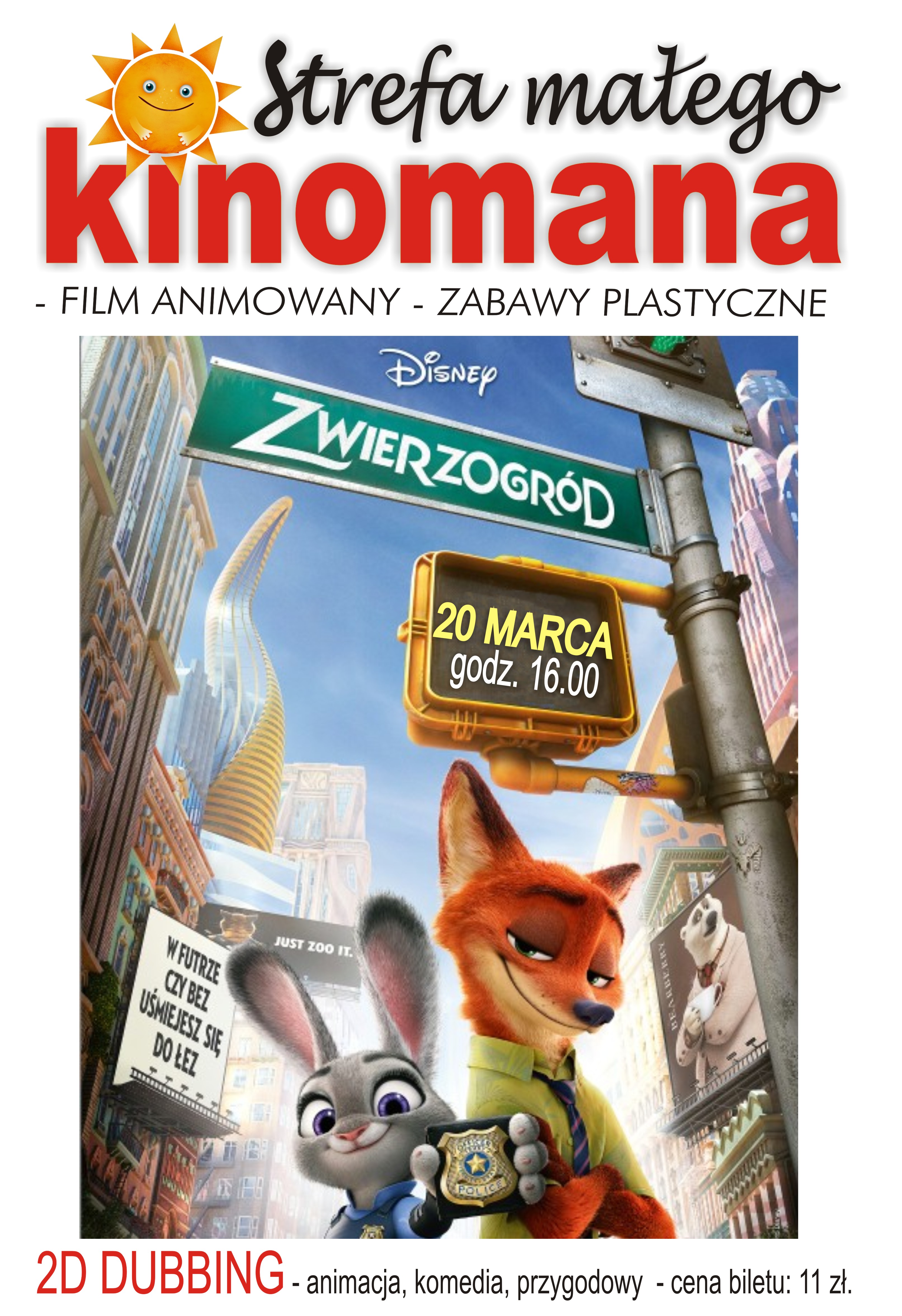 W najbliższą niedzielę kolejna STREFA MAŁEGO KINOMANA. Wszystkie maluchy zapraszamy na filmowe spotkanie z przesympatycznymi bohaterami "Zwierzogrodu". Dodatkiem do bajki będą fantastyczne zabawy plastyczne. A wszystko to w bardzo korzystnej cenie biletu: 11 zł zarówno dla dziecka jak i osoby dorosłej.... zapraszamy 20 marca o godz. 16.00 do kina "Impresja" w Połańcu.