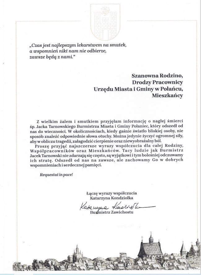 Słowa „Idź przez życie tak, aby ślady twoich stóp przetrwały cię” patrząc na pracę naszego Śp. Burmistrza mają dziś swój ponadczasowy wymiar – tak bowiem szedł przez życie nasz Śp. Burmistrz Jacek Tarnowski, a ślady Jego stóp widzimy dziś wszędzie. Niech w tych trudnych chwilach chociaż one będą dla nas wszystkich pokrzepieniem.