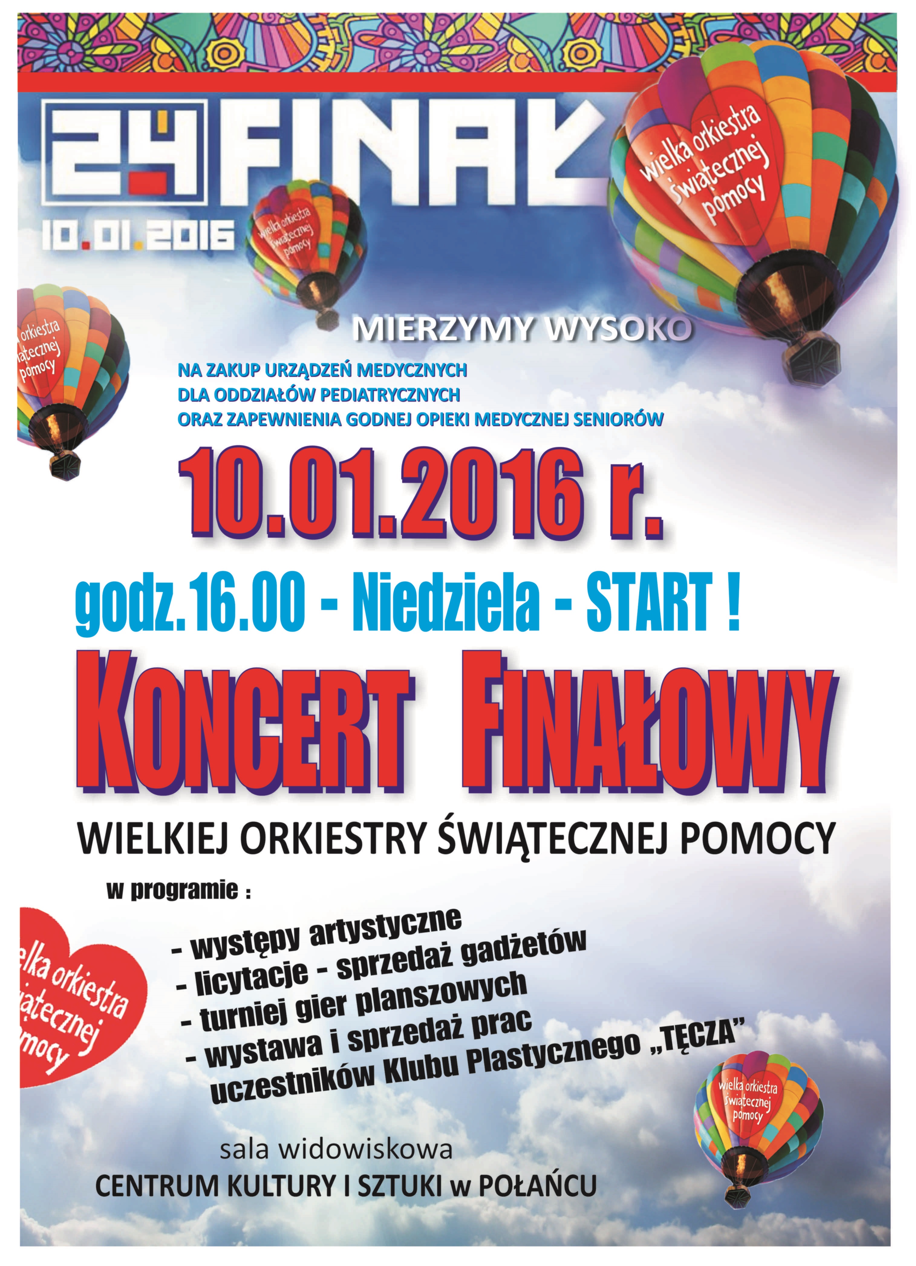 Czekamy na wszystkich ofiarodawców, którzy zechcą ją wesprzeć i przekazać przedmiot czy gadżet do licytacji podczas niedzielnego XXIV Finału Orkiestrowego Grania. Pieniądze uzyskane z licytacji pomogą wrócić do zrowia chorym przebywającym na oddziałach pediatrycznych i geriatrycznych. Warto wesprzeć nas w wielkoorkiestrowych działania by wywołać uśmiech na twarzy każdego chorego dziecka i seniora.... Prosimy o dostarczanie gadżetów i przedmiotów przeznaczonych do licytacji do Centrum Kultury i Sztuki w Połańcu pokój Organizacja imprez do dnia 8 stycznia 2016 (piątek). Za każdą; nawet najmniejszą pomoc serdecznie dziekujemy ....