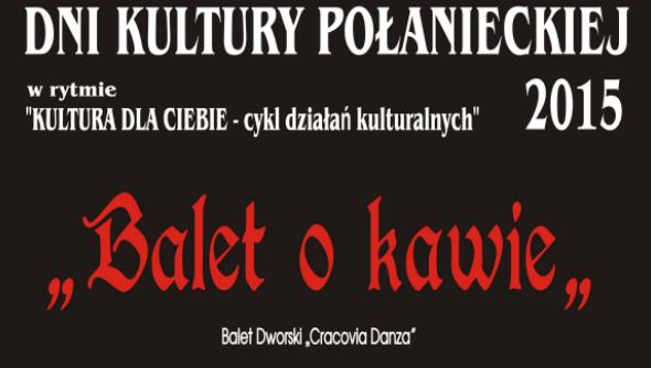 Naszą ostatnią propozycją w ramach Dni Kultury Połanieckiej 2015 w rytmie KULTURA DLA CIEBIE - cykl działań kulturalnych jest spektakl baletowopantomimiczny"BALET O KAWIE" w wykonaniu Baletu Dworskiego „Cracovia Danza”. W najbliższą niedzielę 13 grudnia o godz. 18.00 zapraszamy całe rodziny: dorosłych i dzieci na niespotykane połączenie na jednej scenie tańca barokowego, baletu i pantomimy. Pełne humoru i fantastycznych kostiumów przedstawienie nawiązuje do słynnej Kantaty o kawie Jana Sebastiana Bacha. Za sprawą Romany Agnel ożywa XVIII-wieczna drezdeńska porcelana. Kto chce zobaczyć jak potrafią tańczyć filiżanki, cukiernica, dzbanek i maleńkie ziarenka kawy..... koniecznie musi przyjść do Centrum Kultury i Sztuki w Połańcu. Wstęp wolny dla każdego za okazaniem wejściówki ....