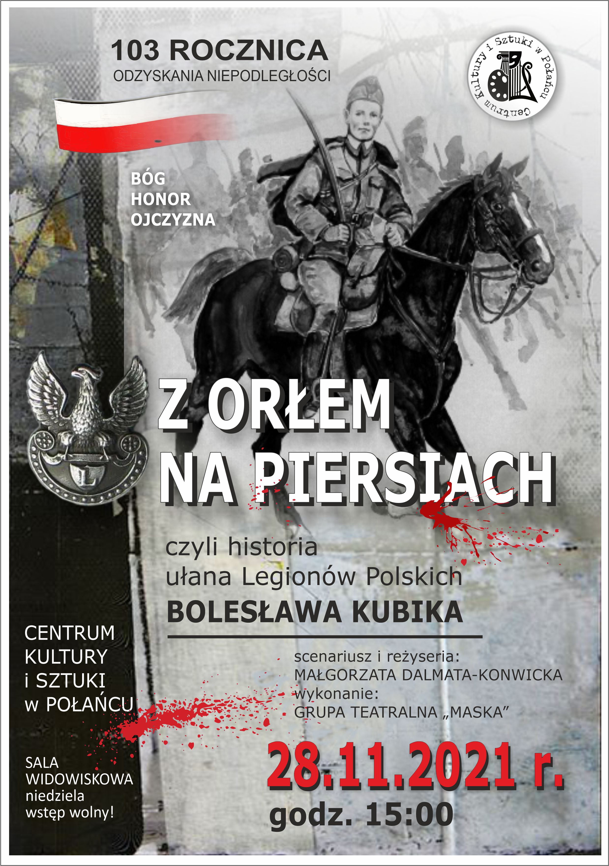 Centrum Kultury i Sztuki w Połańcu zaprasza po raz drugi na inscenizację historyczną "Z ORŁEM NA PIERSIACH" w wykonaniu grupy teatralnej "Maska". Niedziela, 28 listopada o godz. 15.00.
