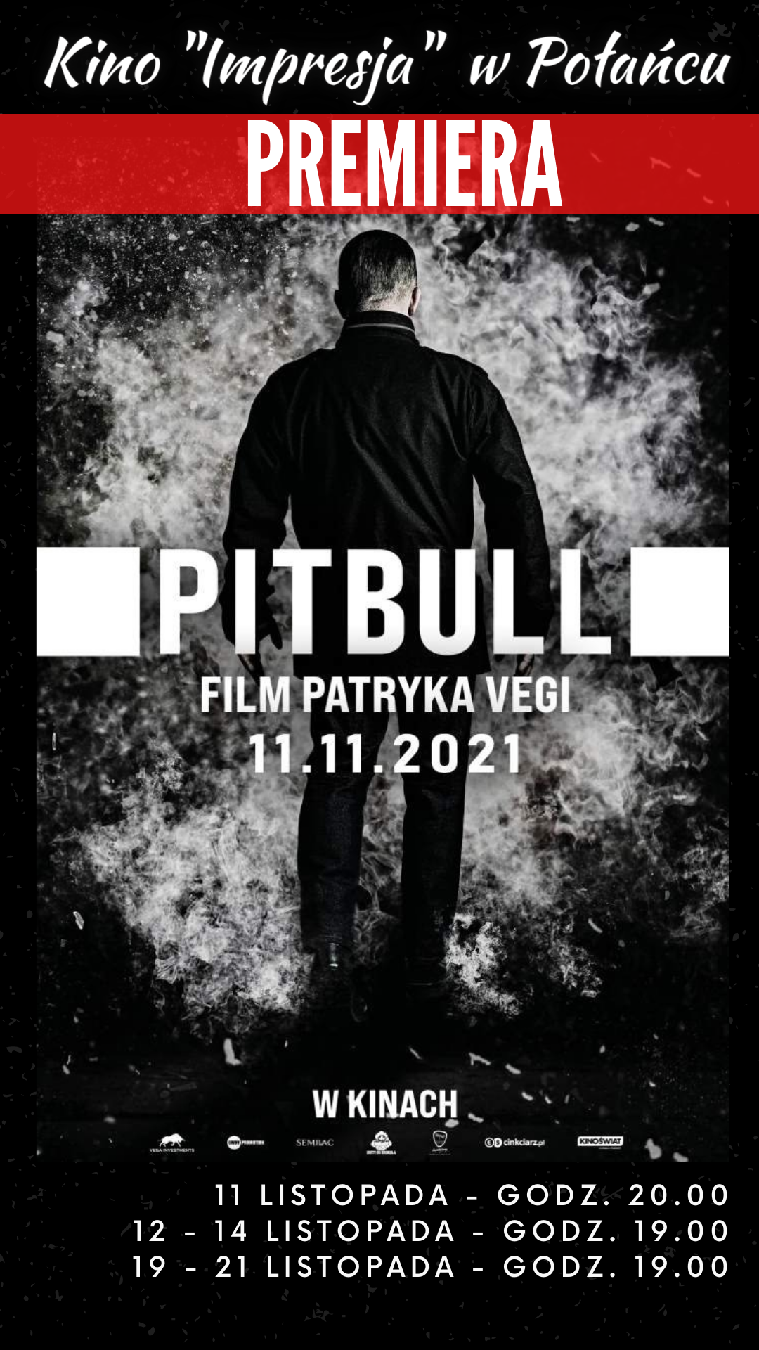 Powrót legendy. Seria "Pitbull" w reżyserii Patryka Vegi wraca na ekrany kinowe w Polsce. 11 listopada o godz. 20.00 zapraszamy na PREMIERĘ FILMU w Kinie "Impresja" w Połańcu. W gwiazdorskiej obsadzie produkcji – weteran i ikona serii – Andrzej Grabowski oraz: Przemysław Bluszcz, Sebastian Dela, Tomasz Dedek, Dawid Czupryński, Damian Białas, Natan Gołębiewski, Dominik Gorbaczyński, Jan Hrynkiewicz, Justyna Karłowska, Michał Karmowski i inni.