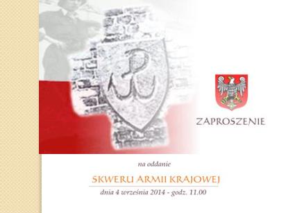 Przepiękna, słoneczna pogoda towarzyszyła patriotycznej uroczystości, jaka miała miejsce 4 września 2014r. na placu zlokalizowanym przy zbiegu ulic Generała Józefa Zajączka i Generała Antoniego Madalińskiego nazwanym „Skwerem Armii Krajowej”. To właśnie tutaj powstał kamień wraz z tablicą upamiętniającą Oddziały Armii Krajowej. „Pamięć o tych niezwykłych ludziach wymaga od nas analizowania losu całego pokolenia, a także niezwykłych dokonań całego państwa podziemnego. Dzieło to utrwali pamięć o żołnierzach AK i o Ich bohaterstwie.