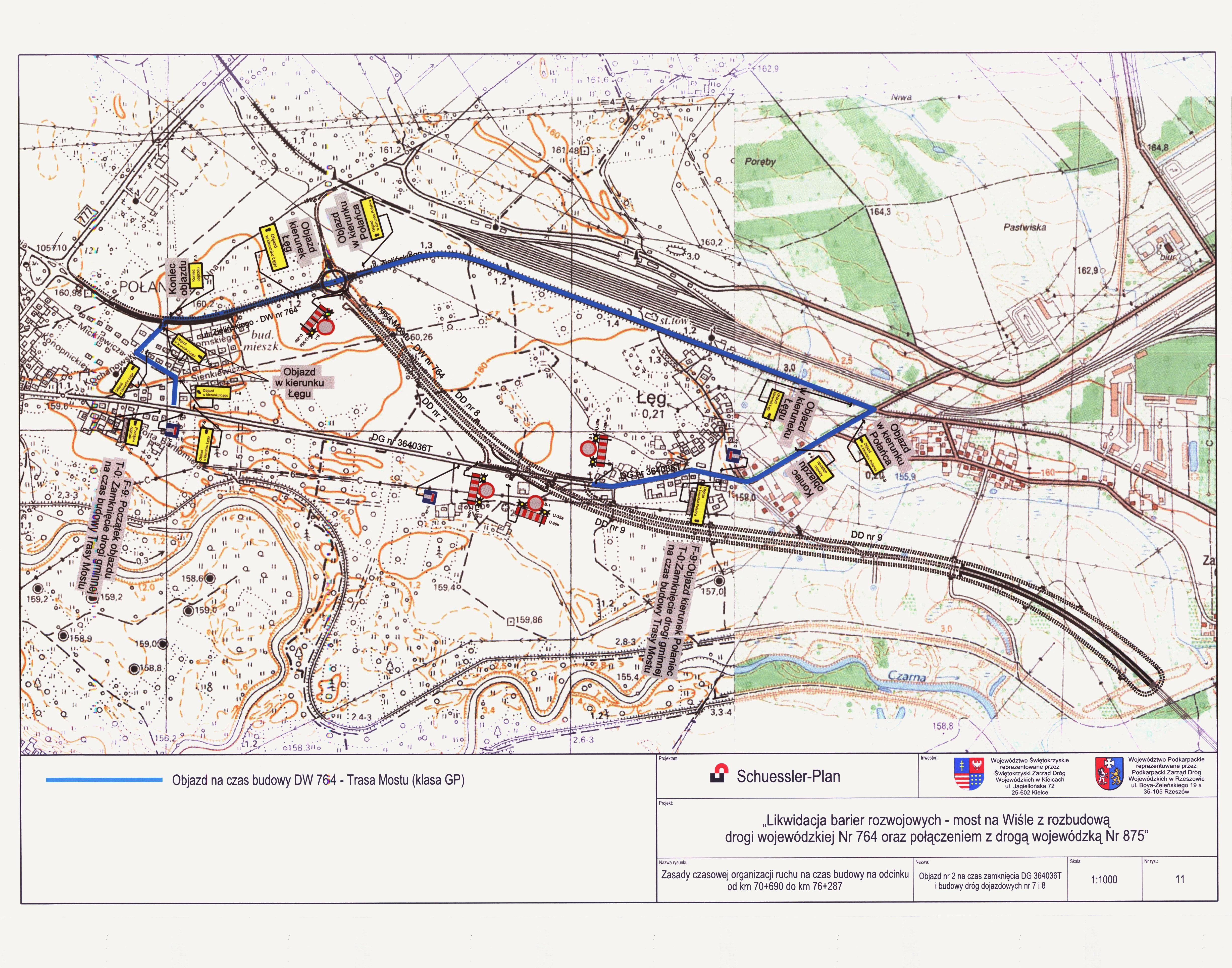 W związku z budową mostu przez Wisłę i dróg dojazdowych zachodzi konieczność zmiany organizacji ruchu na drodze gminnej Połaniec – Łęg, ul. Jędrusiów. Zmiana ruchu nastąpi z dniem 22 listopada 2013r. Na czas budowy tj. do października 2014 roku wyznacza się objazd z Połańca ulicami: Sienkiewicza, Kochanowskiego, Zielińskiego, drogą powiatową w kierunku Elektrowni, następnie na skrzyżowaniu drogi powiatowej z drogą do Elektrowni należy skręcić w prawo do Łęgu. Dopuszczalny tonaż jeżdżących samochodów do 3,5 tony (nie dotyczy PGK i mieszkańców) przy ulicach - Sienkiewicza, Kochanowskiego i przez Łęg. W październiku 2014r. planowane jest oddanie do użytku dróg serwisowych wzdłuż drogi wojewódzkiej łączącej Połaniec z Łęgiem przebiegającej pod mostem, jak również według zapewnień Zarządu Dróg Wojewódzkich w Kielcach oddanie do użytku przejazdu pod drogą w nasypie drogi wojewódzkiej łączącego Połaniec z Łęgiem (2,5 m wys. i 5 m. szer. dla pojazdów o małych gabarytach).