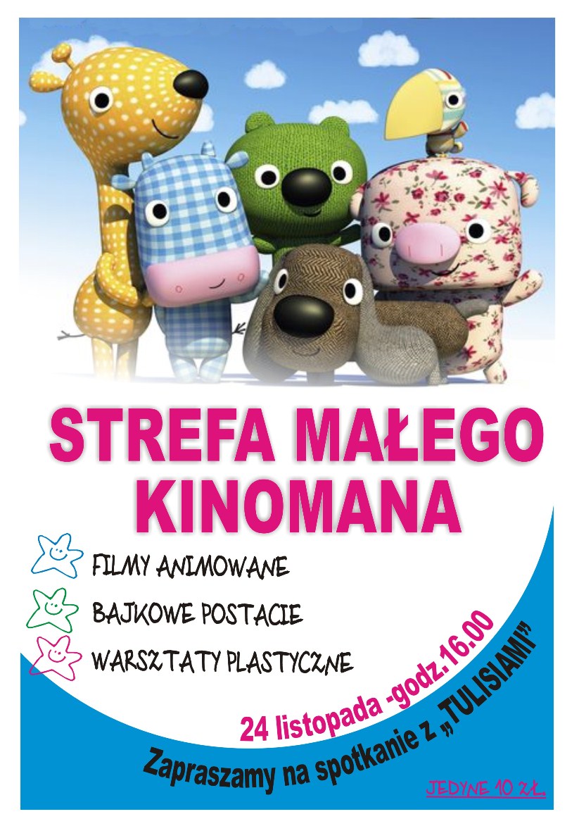 Od 24 listopada w Centrum Kultury i Sztuki w Połańcu rusza Strefa Małego Kinomana... a w niej: atrakcyjne bajki animowane dla najmłodszych (bajki bez przemocy), postacie bajkowe i warsztaty plastyczne. To wszystko za jedyne 10 zł. Zapraszamy wszystkie dzieci do Strefy Małego Kinomana i na spotkania z Tulisiami już 24 listopada (niedziela) o godz. 16.00.