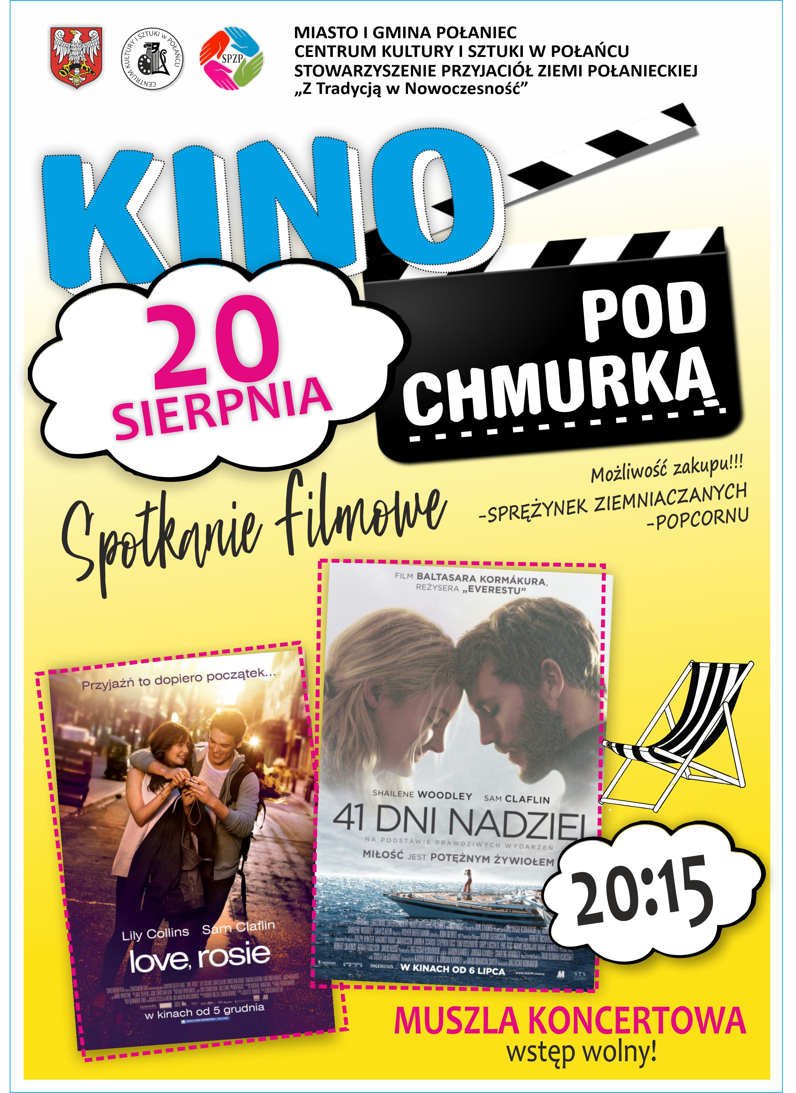 Zapraszamy 20 sierpnia na filmowe spotkanie w plenerze pod hasłem KINO POD CHMURKĄ. Startujemy o godz. 20.15 na placu muszli koncertowej w Połańcu. Zaczynamy komediodramatem "Love, Rosie, a kończymy kinową ekranizacją prawdziwych wydarzeń "41 dni nadziei". Udostępniamy leżaki, choć w ograniczonej ilości. Zabierzcie ze sobą koce. Ciepłe przekąski można będzie zakupić na miejscu. WSTĘP WOLNY DLA KAŻDEGO !!
