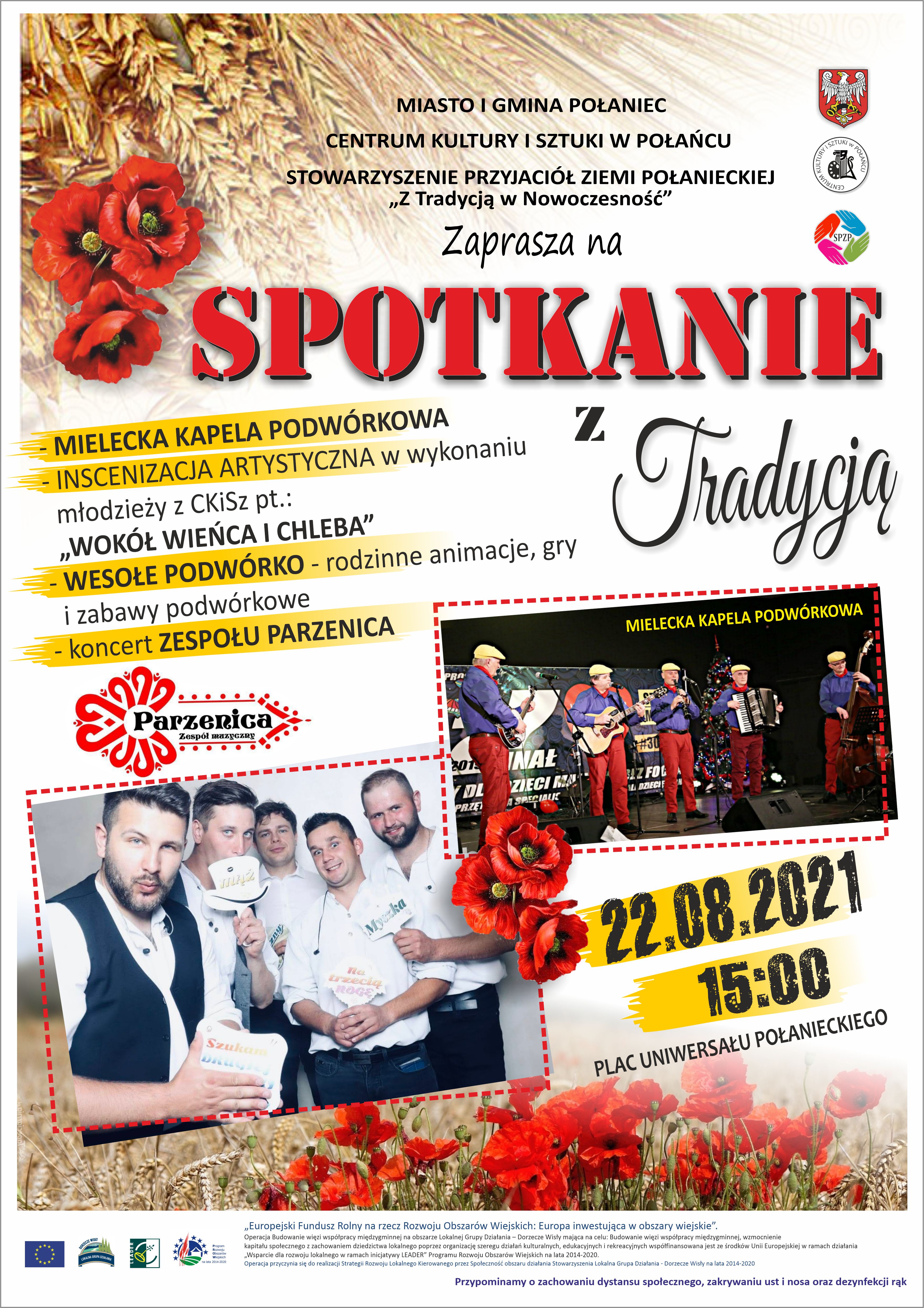 Kolejne Spotkanie z Tradycją już w najbliższą niedzielę; 22 sierpnia o godz. 15.00 na Placu Uniwersału Połanieckiego. Gwarantujemy 5 godzin znakomitej zabawy dla dzieci i dorosłych. Spotkanie rozpocznie na ludową nutę Mielecka Kapela Podwórkowa, a zakończy z góralską energią zespół Parzenica. W programie również inscenizacja "Wokół wieńca i chleba" w wykonaniu młodzieży z Centrum Kultury i Sztuki w Połańca oraz rodzinne animacje i zabawy podwórkowe dla wszystkich. Zapraszamy :)