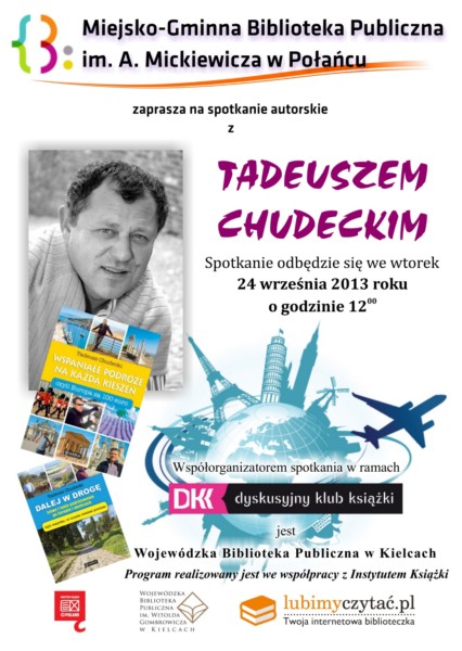 Tadeusz Chudecki to aktor filmowy, teatralny i serialowy, a także autor książek o tematyce podróżniczej - zapalony wojażer, który odwiedził przeszło 90 krajów! Podczas dzisiejszego spotkania autorskiego zorganizowanego w Miejsko – Gminnej Bibliotece w Połańcu gość prezentuje i promuje dwie własne publikacje "Wspaniałe podróże na każdą kieszeń, czyli Europa za 100 euro" oraz "Dalej w drogę. Łatwe i tanie podróżowanie po Europie, czyli wszystko co turysta wiedzieć powinien".