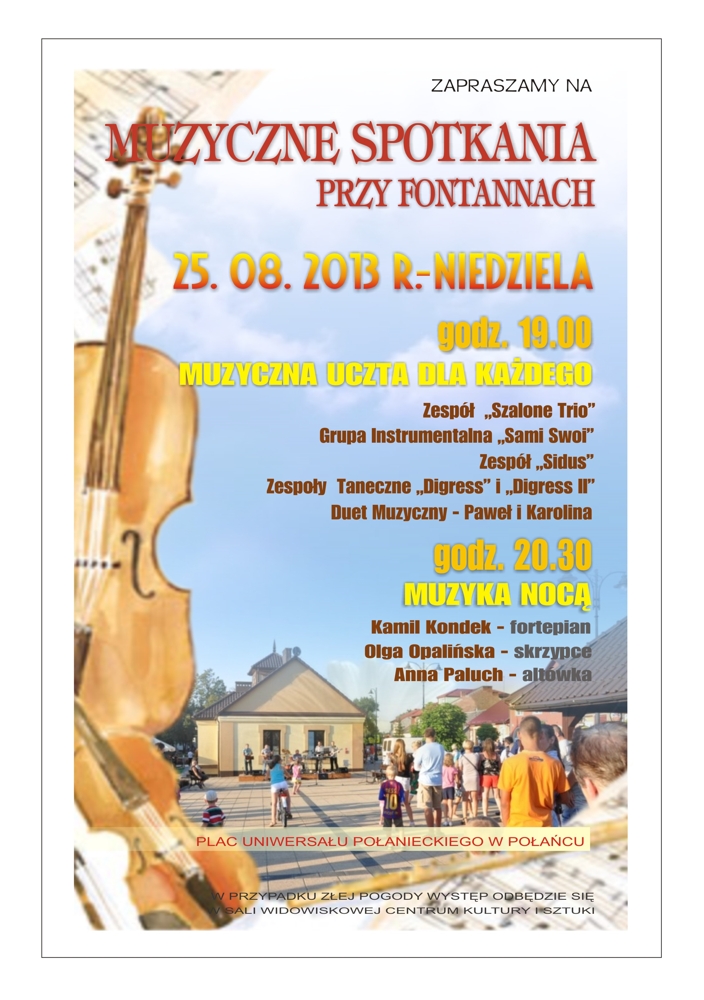 Czy usłyszenie i zobaczenie dziesięciu występów muzycznych jednego wieczoru jest możliwe? W Połańcu oczywiście, że tak. 25 sierpnia, punkt 19.00, na rynku przy fontannach odbyło się kolejne cykliczne – muzyczne spotkanie pod gołym niebem. Pogoda wymarzona - powiewał lekki, przyjemny wietrzyk, zachód słońca i w roli głównej muzyka… światło… woda. Widzów przybywało… przychodziły całe rodziny z dziecięcymi wózkami, młode pary rozkładające się wygodnie przy fontannach i starsze osoby odpoczywające na ławeczkach. Frekwencja jednym słowem nad wyraz dopisała. Widać, że Połańczanie żądni są kolejnych tego rodzaju plenerowych spotkań muzycznych. Ostatnia niedziela na połanieckim rynku to niemalże maraton muzyczny. Warto było przyjść – zobaczyć i posłuchać zjawiskowego widowiska.