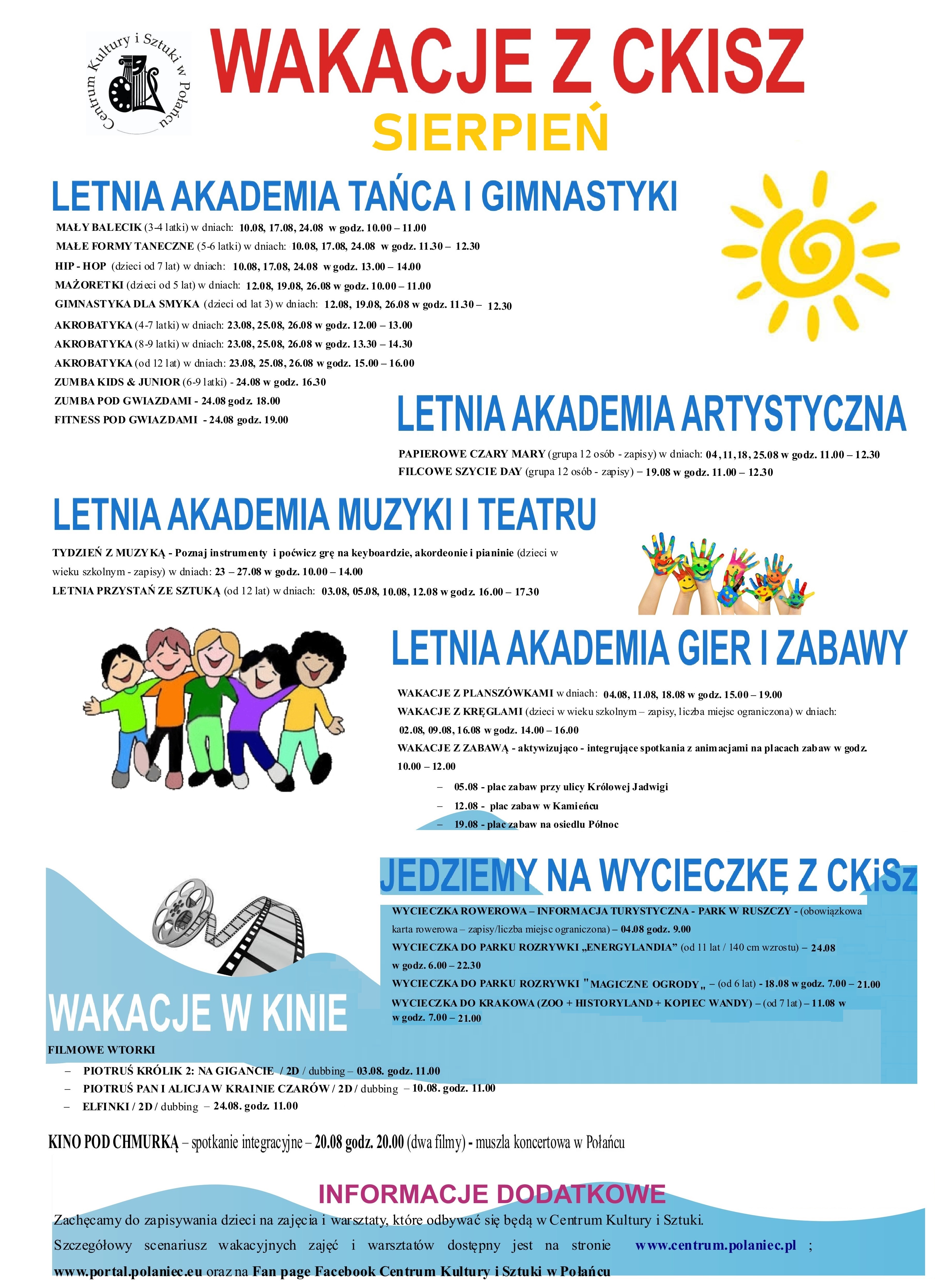 Zapraszamy do udziału w WAKACJACH Z CKisz ...W sierpniu mnóstwo ciekawych warsztatów, zajęć, wycieczek, spotkań z planszówkami, w kinie i na placach zabaw.