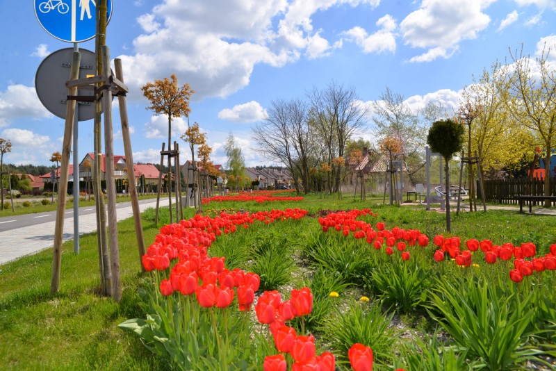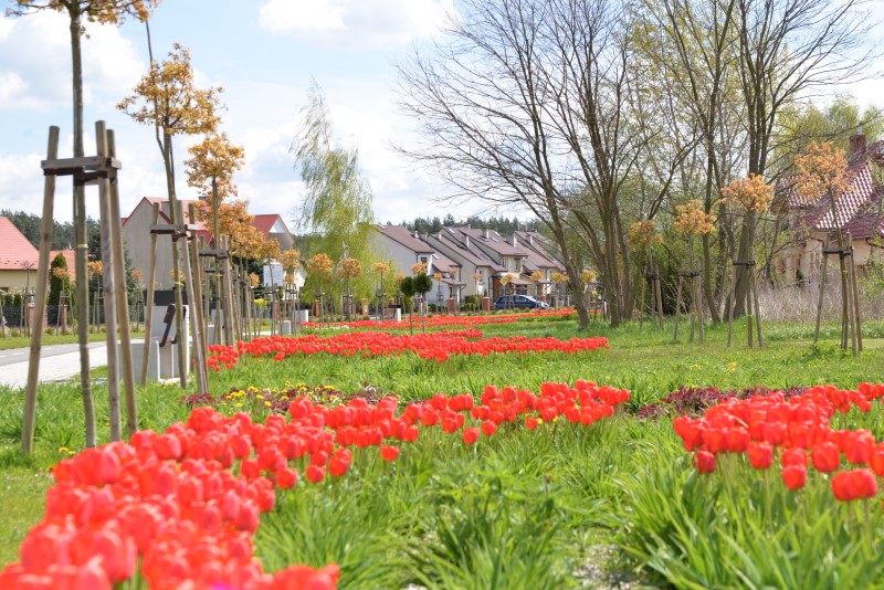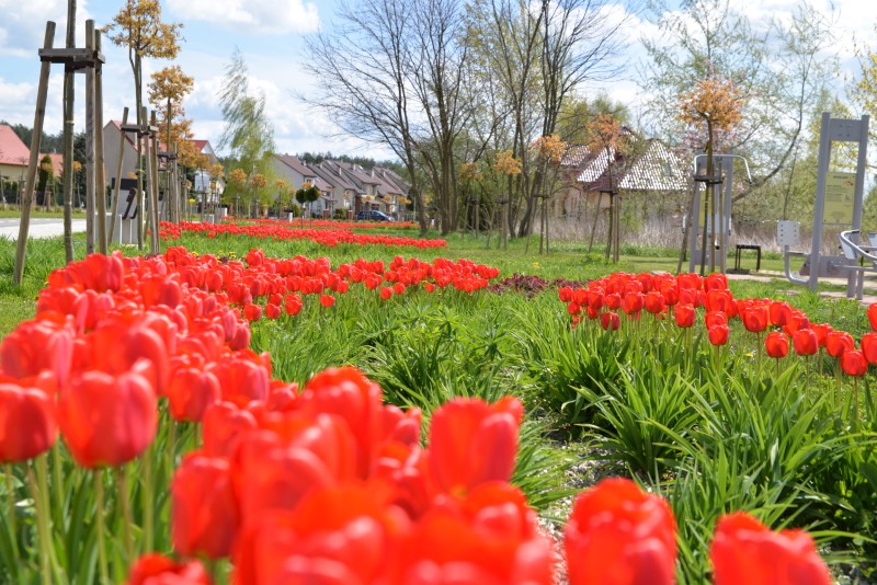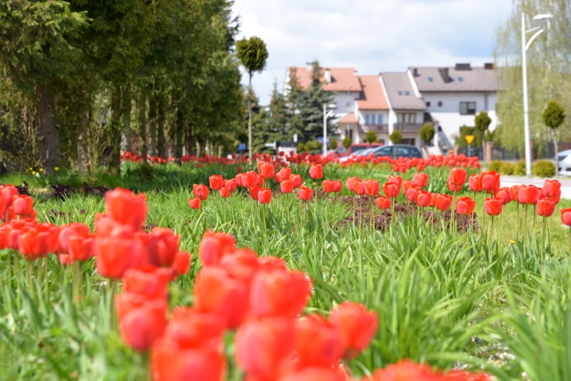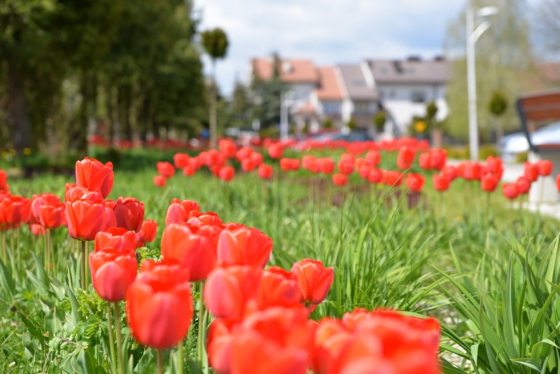 Łan kwitnących czerwono tulipanów ozdabiał na wiosnę Osiedle Południe. Tulipany i tej wiosny wybuchły piękną czerwienią oznajmiając, że ciepło do nas nadchodzi. Do kwiatów bowiem najbardziej kojarzonych z wiosną należą tulipany. Tulipan to jeden z popularniejszych kwiatów, które spotykamy w naszych ogrodach czy kwiaciarniach. Gatunków tulipanów jest ponad sto, a odmian powyżej 10 tysięcy. Pięknie przyozdabiają miejsca gdzie tylko się pojawią. Na następny widok będziemy musieli poczekać do kolejnej wiosny.