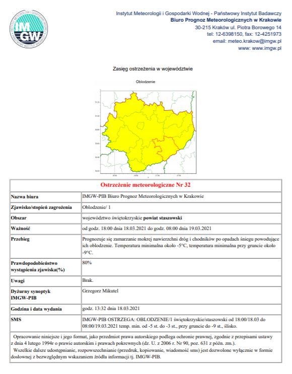 Ostrzeżenie meteorologiczne obowiązuje od godziny 18:00 dnia 18.03.2021 roku do godziny 08:00 dnia 19.03.2021 roku