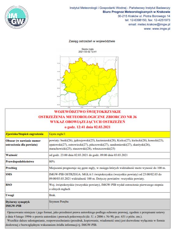 Ostrzeżenie meteorologiczne prognozujące gęstą mgłę od godziny 23:00 dnia 02.03.2021 roku