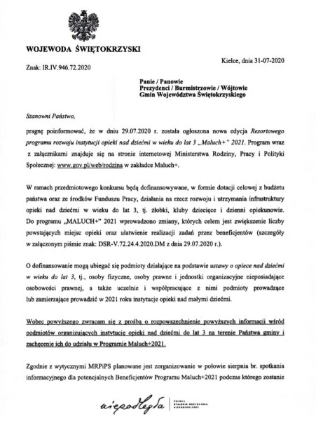 Pismo Wojewody Świetokrzyskiego dotyczące Resortowego programu rozwoju instytucji i opieki na dziećmi w wieku do lat 3"Maluch+" 2021.