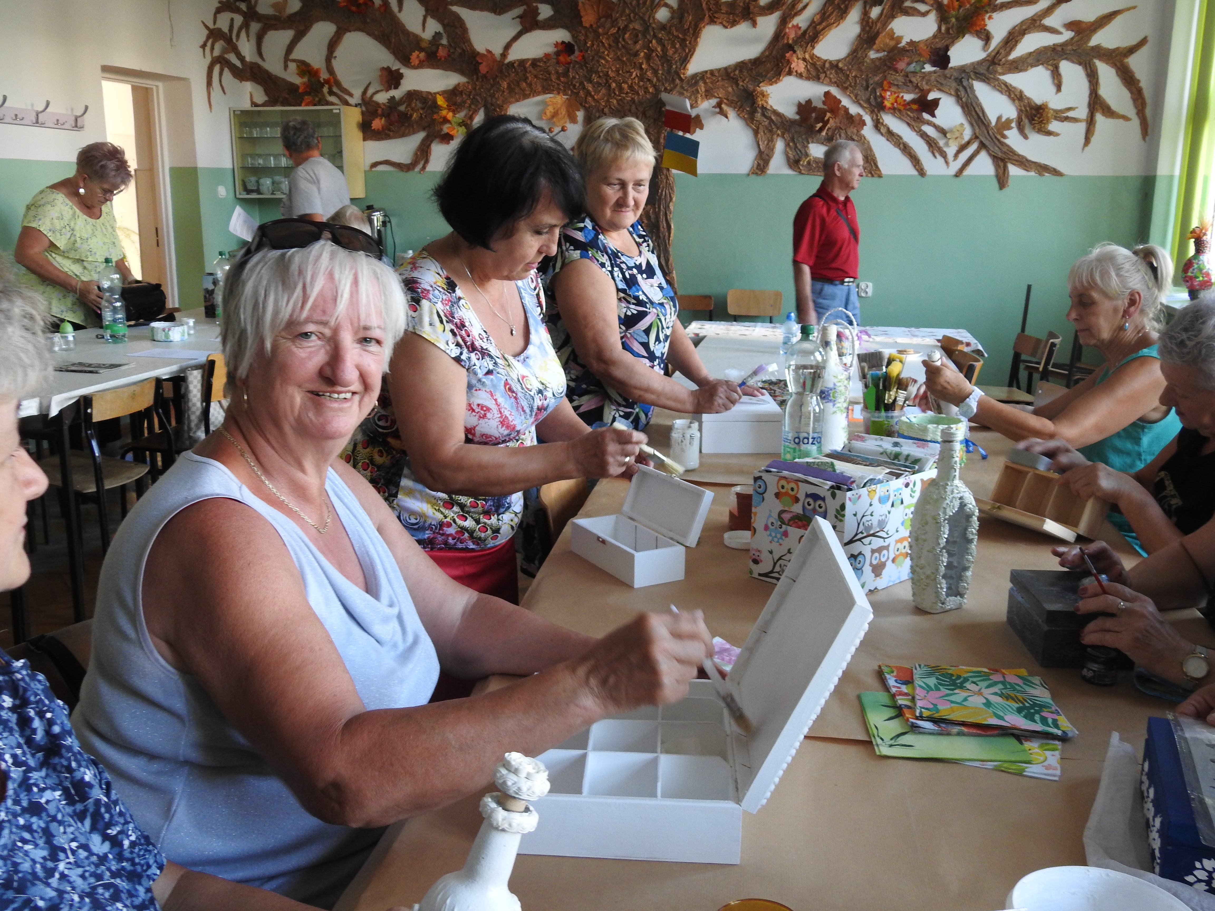 Wielu seniorów nadal prowadzi aktywnie życie zawodowe, niektórzy są na emeryturze i w tym właśnie czasie poszukują możliwości rozwoju osobistego, chcąc być obecnym w życiu społecznym, kulturalnym, rozumieć zmiany i być ich częścią. Są tacy, którzy po prostu lubią się uczyć, są ciekawi świata, ludzi, sztuki, muzyki… A doskonałym tego przykładem są nasi seniorzy z klubu „Megawat". W ramach cyklicznych spotkań odbywają się dyskusje o sztuce współczesnej oraz działania twórcze, które rozwijają procesy poznawcze, doskonaląc sprawność manualną poprzez poznawanie różnych technik i form plastycznych. W ramach projektu „ZADBAJ PO COVIDZIE O ZDROWIE SENIORZE – RUCH I SIARKA CI W TYM POMOŻE” zostały zorganizowane warsztaty plastyczne zdobienia przedmiotów techniką decoupage czy malowanie na drewnie.