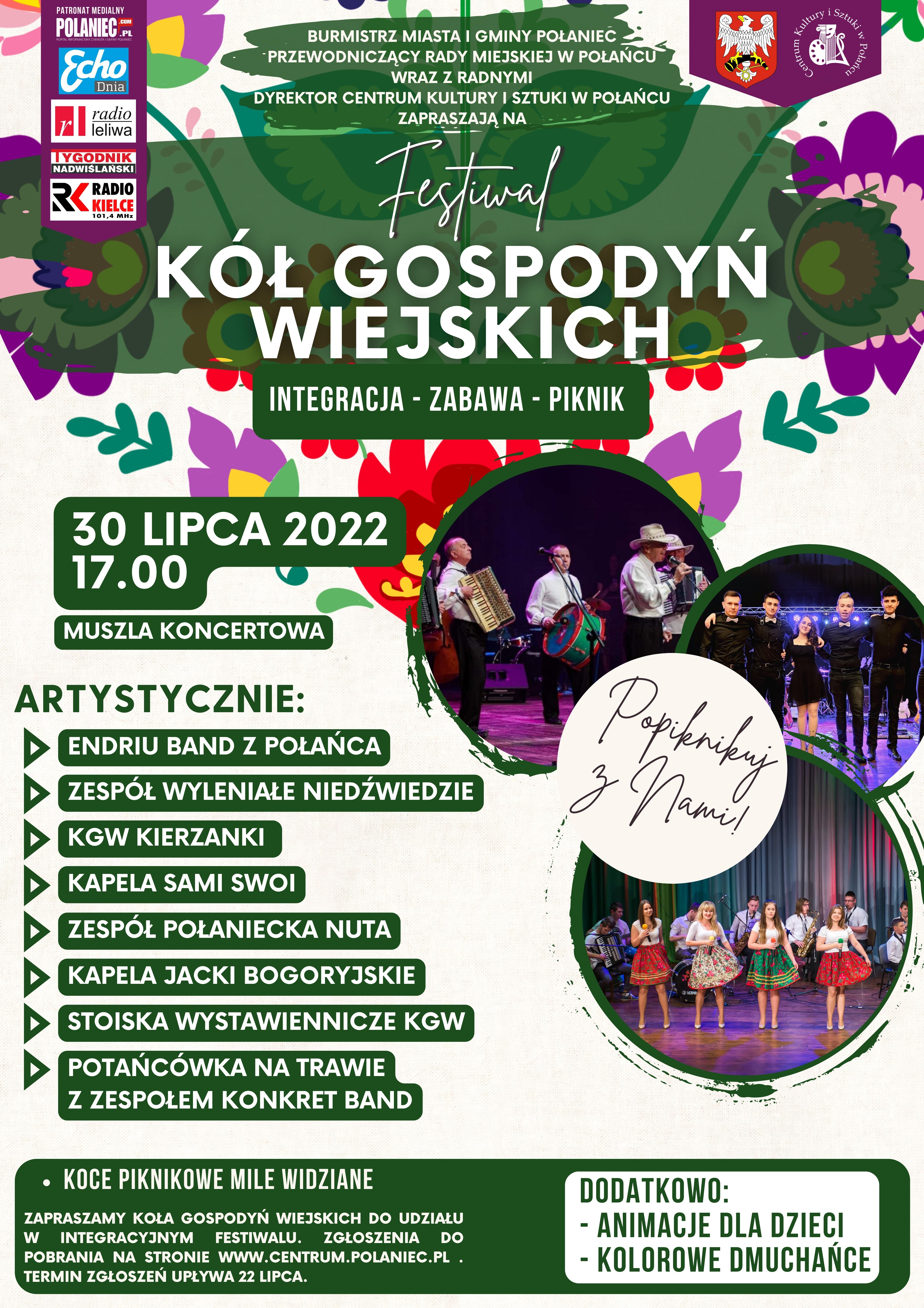 30 lipca 2022 r. pod hasłem wspólnej integracji i dobrej zabawy odbędzie się Festiwal Kół Gospodyń Wiejskich. Serdecznie zapraszamy.