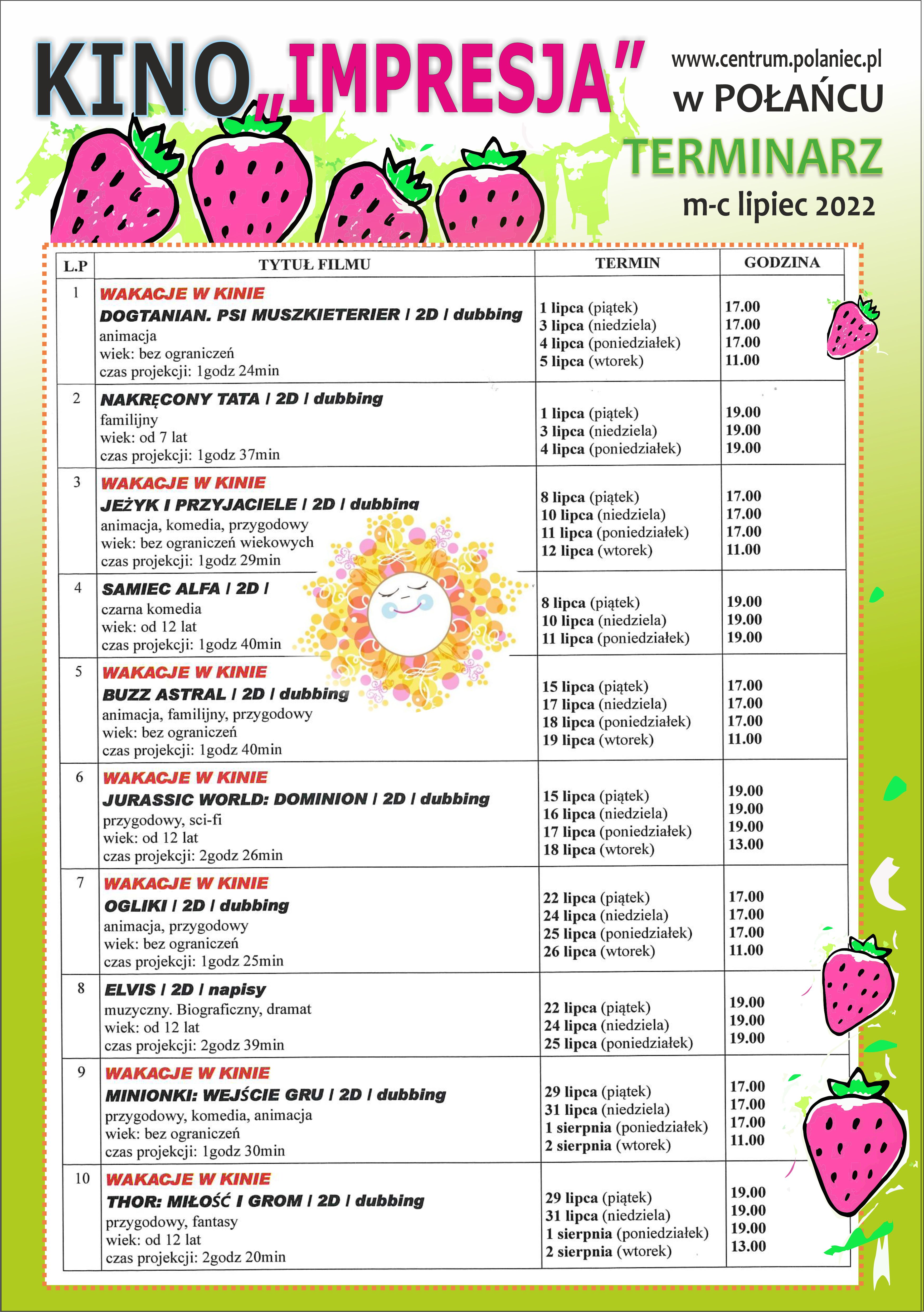 Śpieszymy z informacją iż nasze, połanieckie kino "Impresja" podczas wakacji działało będzie na wysokich obrotach. Dla dzieci i młodzieży zaplanowaliśmy WAKACJE W KINIE, a dla dorosłych ciekawe propozycje filmowe. Lipiec w kinie zapowiada się ciekawie. Zapraszamy