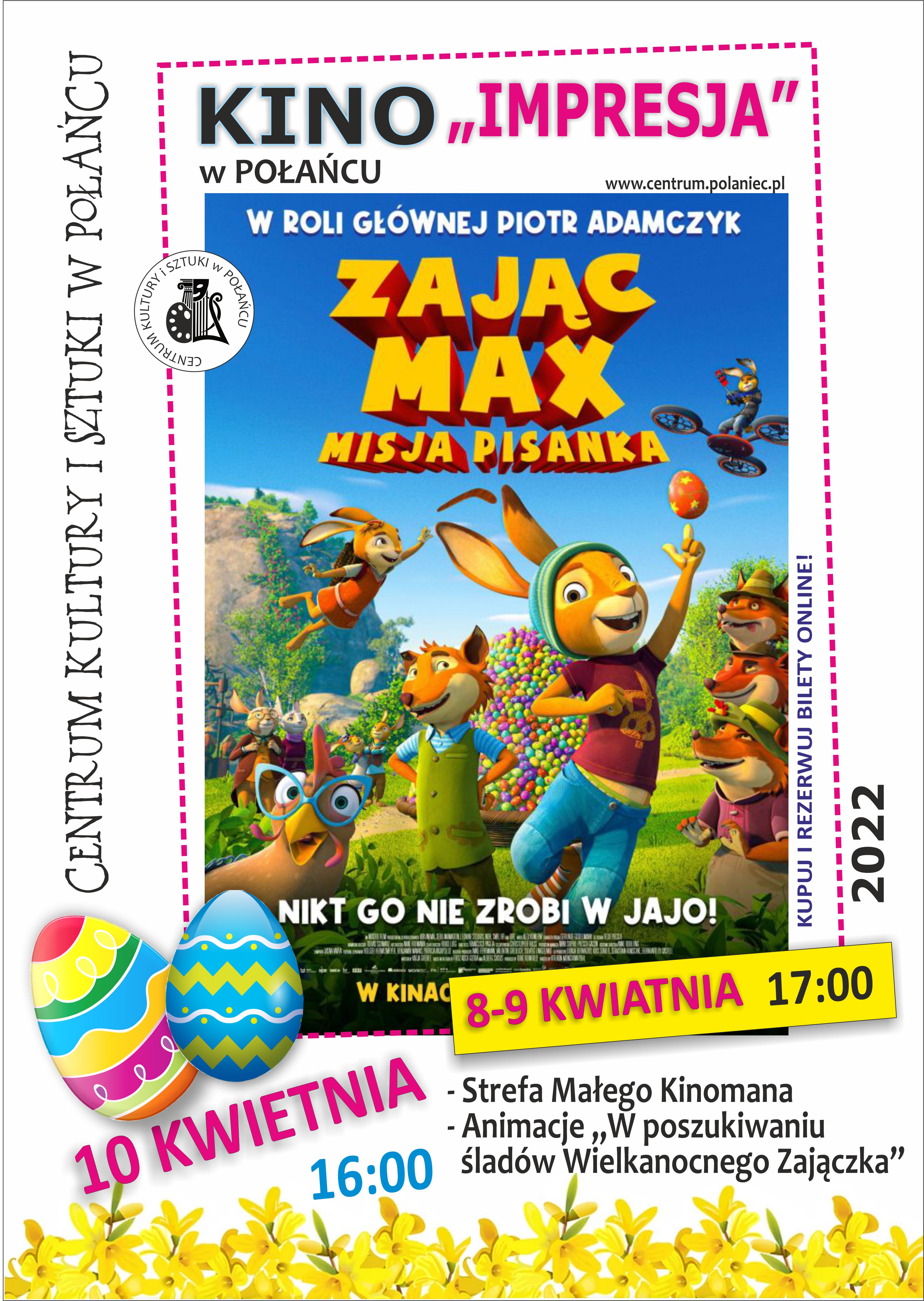 W najbliższy weekend 8 -10 kwietnia zapraszamy na dwie nowości filmowe. W piątek i sobotę o godz. 17.00 planujemy świąteczną animację dla najmłodszych "Zając Max: misja pisanka", a o godz. 19.00 polski dramat "Inny świat. W niedzielę zapraszamy dzieci do kina na godz. 16.00. na Strefę Małego Kinomana z warsztatami plastycznymi.