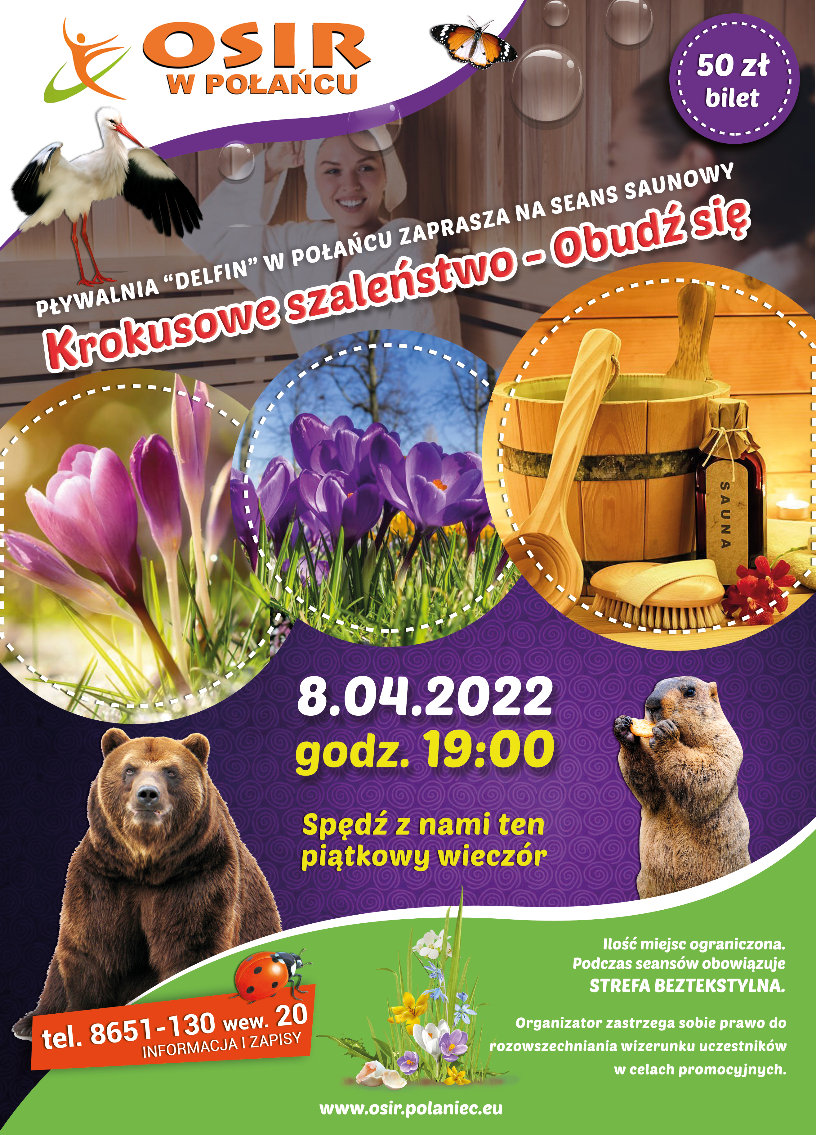 „ Serdecznie zapraszamy na wieczór saunowy w dniu 8 kwietnia 2022 r. o godz. 19:00. Zapisy pod numerem tel. 15 8651-130 wew. 20”
