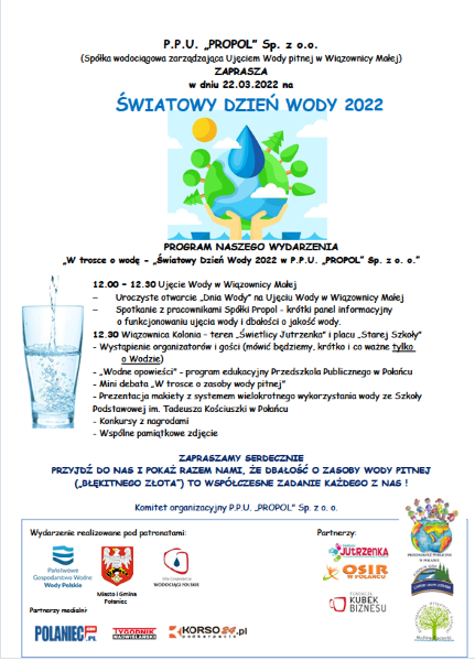 Zasadniczym celem towarzyszącym temu wydarzeniu będzie budowanie świadomości, by wody pitnej nie traktować jako niewyczerpany zasób z racji, że mamy jej na świecie bardzo mało. Do udziału w „Światowym Dniu Wody 2022”, zaproszeni zostali nasi odbiorcy, lokalne władze samorządowe, partnerzy, lokalne i regionalne media, delegacje ze szkół i przedszkoli. Patronat nad „Światowym Dniem Wody 2022 w P.P.U. „PROPOL” Sp. z o. o. został objęty przez m.in.Państwowe Gospodarstwo Wodne Wody Polskie; Burmistrza Miasta i Gminy Połaniec, Izbę Gospodarcza Wodociągi Polskie.
