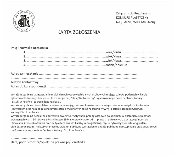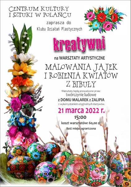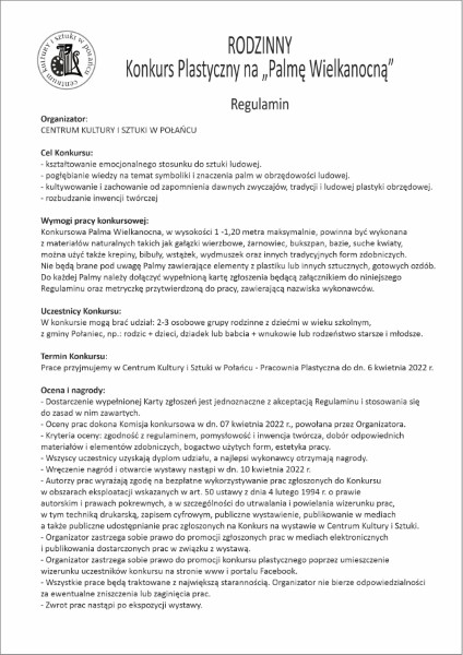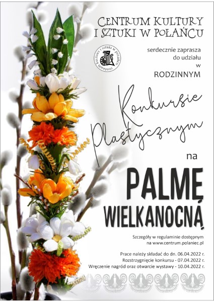 Centrum Kultury i Sztuki w Połańcu zaprasza dzieci i dorosłych do udziału w Rodzinnym Konkursie Plastycznym na Palmę Wielkanocną. Celem konkursu jest kształtowanie emocjonalnego stosunku do sztuki ludowej, pogłębienie wiedzy na temat symboliki i znaczenia palm w obrzędowości ludowej, kultywowanie i zachowanie od zapomnienia dawnych zwyczajów, tradycji i ludowej plastyki obrzędowej oraz rozbudzenie inwencji twórczej.