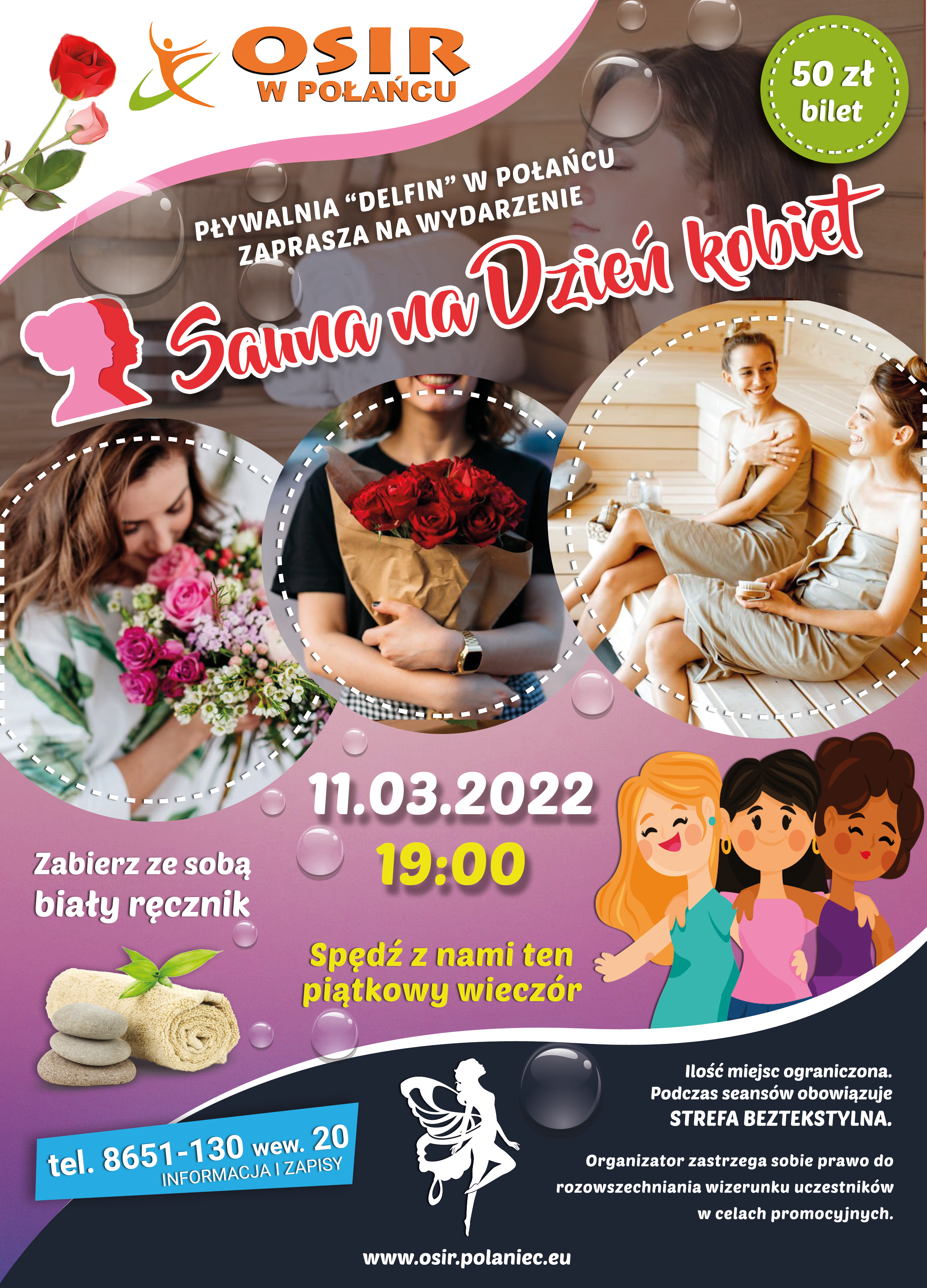 Serdecznie zapraszamy na wieczór saunowy z okazji Dnia Kobiet w dniu 11 marca 2022 r. o godz. 19:00.