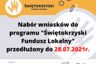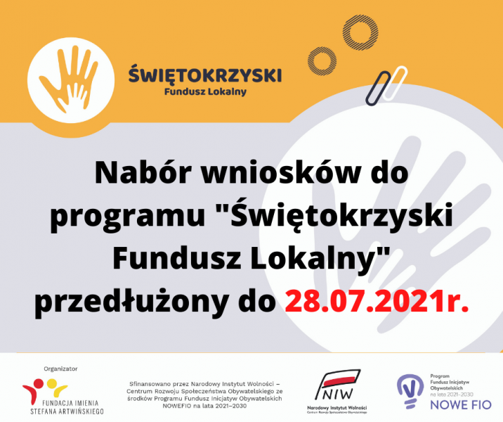 Fundacja Imienia Stefana Artwińskiego informuje, że termin składania wniosków do programu „Świętokrzyski Fundusz Lokalny" został przedłużony do 28.07.2021 r.