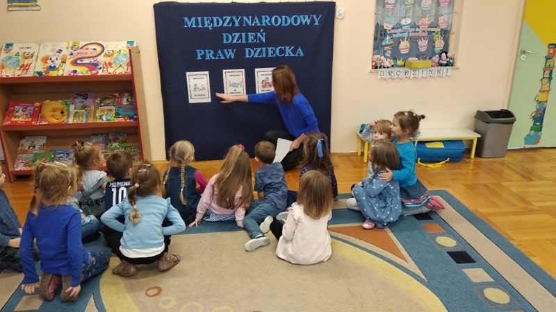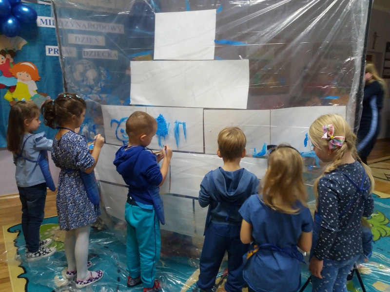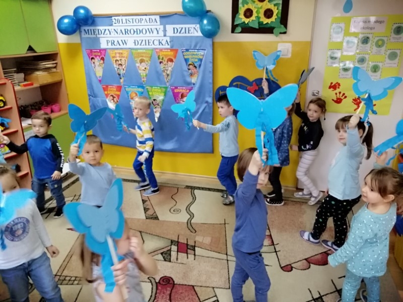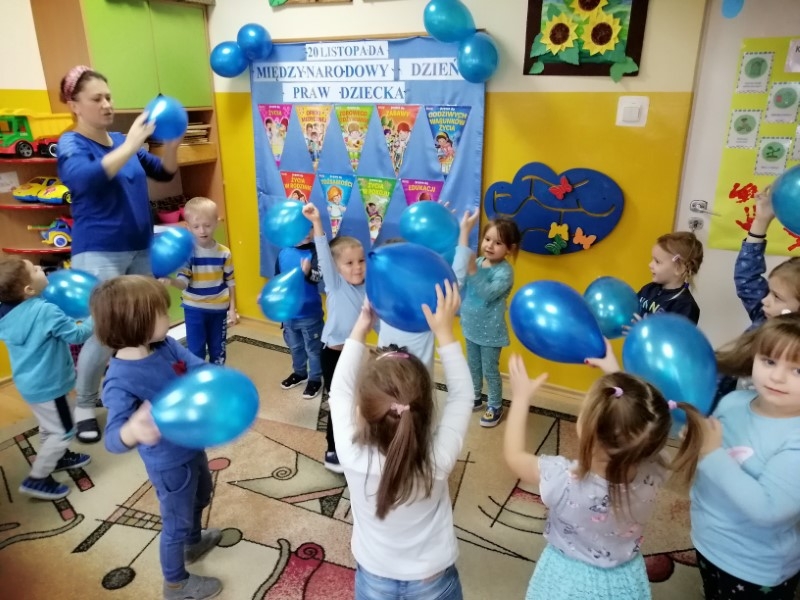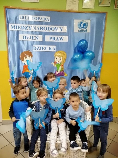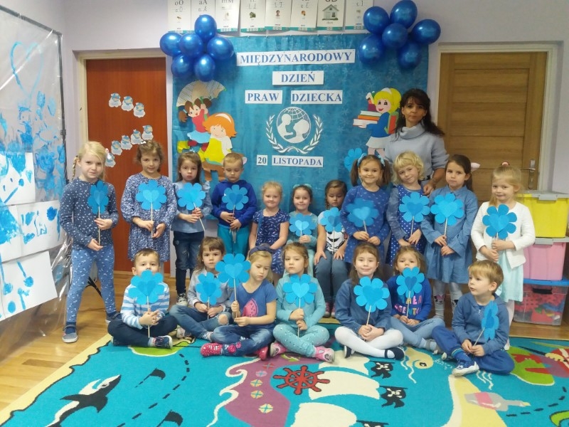 W piątek, 19 listopada, ubrane na niebiesko dzieci z grupy „Jeżyki” i „Kotki” oraz „Motylki” z Przedszkola Publicznego w Połańcu hucznie obchodziły Międzynarodowy Dzień Praw Dziecka. Obchody były impulsem do podejmowania aktywności w zakresie upowszechniania praw dziecka, zarówno wśród najmłodszych obywateli, jak i dorosłych. Tego dnia nasi wychowankowie poprzez słuchanie wierszy, piosenek, oglądanie filmów, emocjonujące gry oraz inne zabawy odróżniali dobro od zła, uczyli się wartościowania zachowań kolegów i własnych a także przypomniały sobie reguły obowiązujące w grupie ponieważ prawa nierozerwalnie idą w parze z obowiązkami i wzrastającym poczuciem odpowiedzialności. Dzieci z grupy „Kotki” pomalowały na niebiesko mural, który zrobiony z folii malarskiej stanął w sali, młodsze przedszkolaki z grupy „Jeżyki” przygotowały przestrzeń dedykowaną pracom plastycznym prezentującym wybrane, najważniejsze dla nich prawa. Natomiast jednym z działań grupy „Motylki” było wykonanie „drzewa moich praw”, gdzie uwiecznione zostały na zielonych listkach najważniejsze według przedszkolaków prawa: do zabawy, do odpoczynku, do miłości… Wychowawcy starali się stworzyć dzieciom warunki by mogły doświadczać co dobre dla nich samych i dla otoczenia, aby dzieci nabyły kompetencje społeczno – moralne umożliwiające im funkcjonowanie w szerszej społeczności.