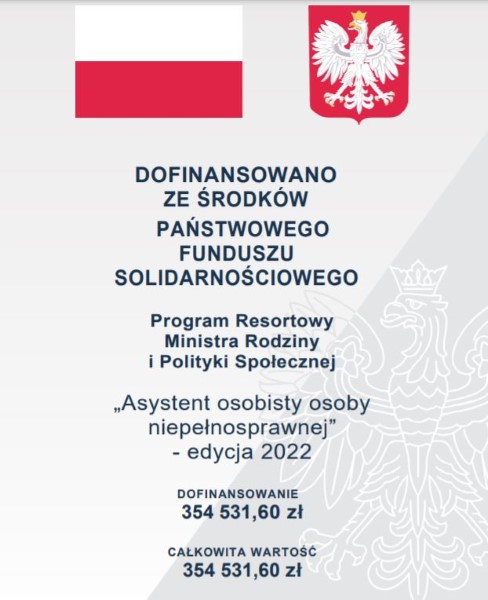 Środki na sfinansowanie Programu „Asystent osobisty osoby niepełnosprawnej”- edycja 2022 pochodzą w 100% z Ministerstwa Rodziny, Pracy i Polityki Społecznej z Funduszu Solidarnościowego.
