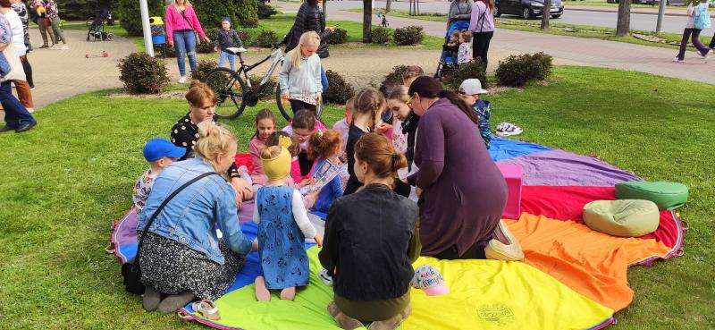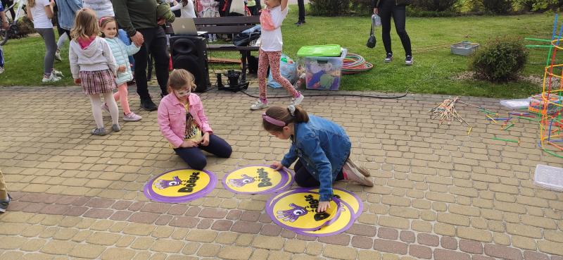 W przerwie między wygibasami chwilę odsapnąć można było w Kąciku Małego Artysty, gdzie czekały na dzieci przybory do rysowania i malowania. Można było także wejść do Biblioteki i poczytać bajeczki przygotowane na piknik. Na nieco mniej aktywnych ruchowo uczestników czekały również słomki konstrukcyjne, z których można było zbudować co tylko przyszło do głowy oraz mega bierki. Był też kultowy karciany Dobble’a, tyle że w wersji XXL.