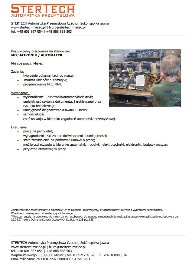 Przedstawiamy cztery oferty pracy na stonowiska: Mechatronik/Automatyk, Elektryk, Pracownik produkcjii/Monter oraz Elektromechanik/Pracownik UR.