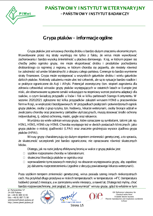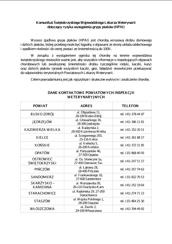 Komunikat Świętokrzyskiego Wojewódzkiego Lekarza Weterynarii dotyczący ryzyka wystąpienia grypy ptaków (HPAI)