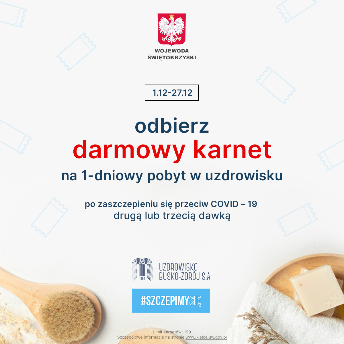 W kampanii Wojewody Świętokrzyskiego, w której można skorzystać z bezpłatnego biletu do kina, teatru lub uzdrowiska mogą wziąć udział osoby, które w dniach 1 grudnia br. - 27 grudnia br. przyjmą drugą lub trzecią dawkę szczepionki przeciwko COVID - 19. Termin realizacji kuponów również obejmuje dni 1 grudnia br. i 27 grudnia br. W przypadku problemów z uzyskaniem kuponu z punktu szczepień prosimy o kontakt z sekretariatem Biura Wojewody, tel. 41 342 12 32